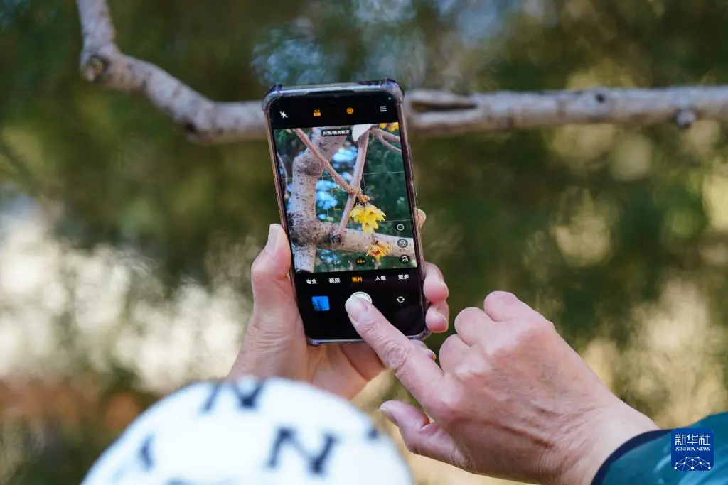 1月10日,游人在北京卧佛寺拍摄腊梅。