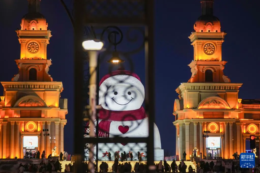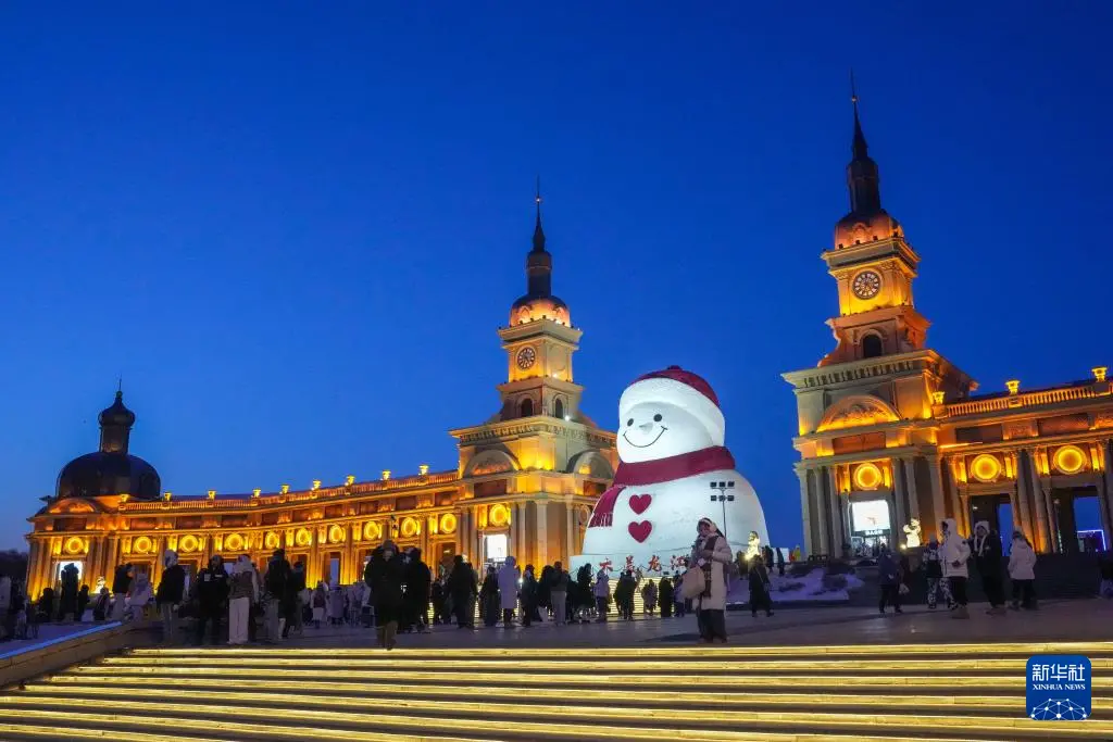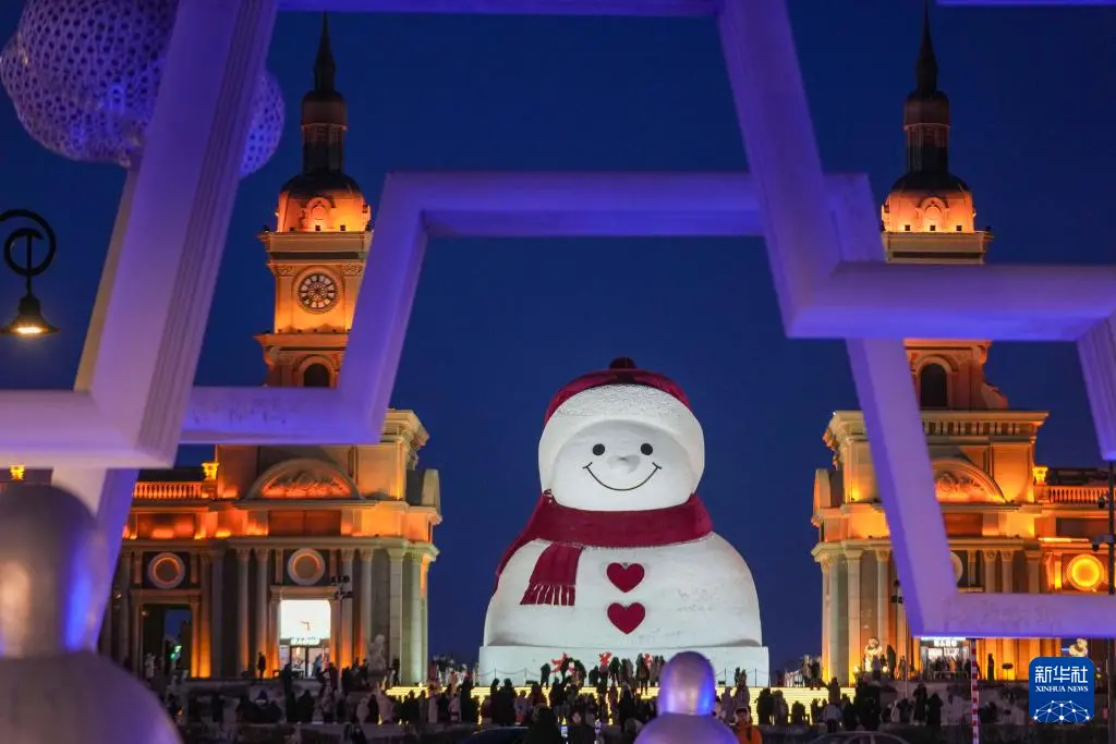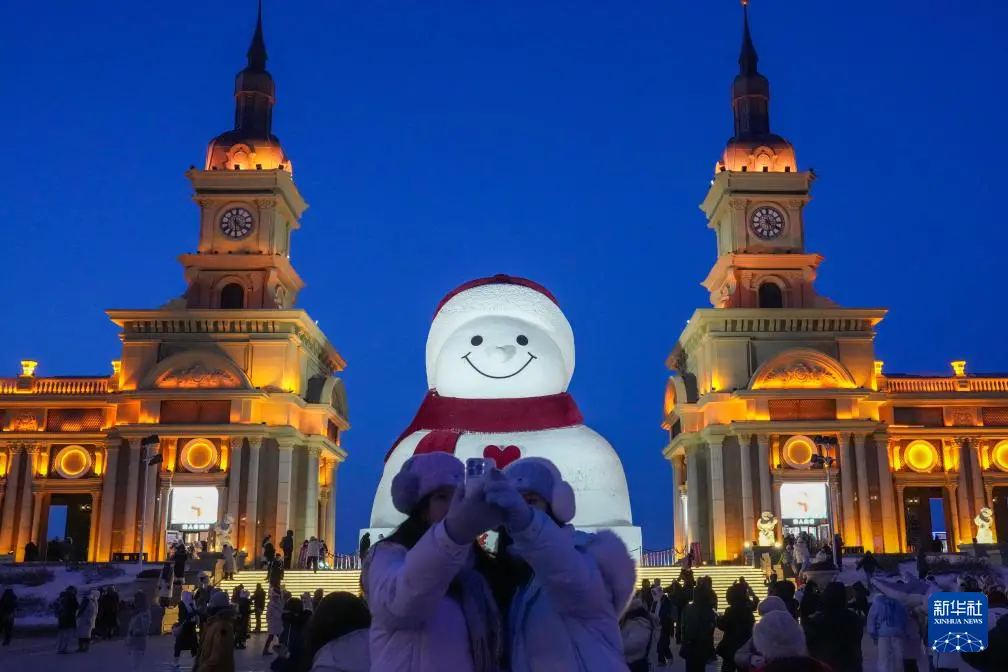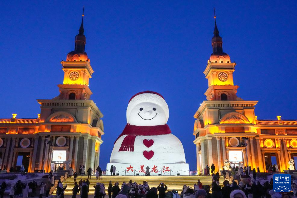时下,“冰城”哈尔滨市正值冰雪旅游旺季。位于哈尔滨市群力音乐公园的大雪人吸引着众多游客前来打卡。日落后的蓝调时刻,在天光与灯光的交相映照下,大雪人更显浪漫迷人。