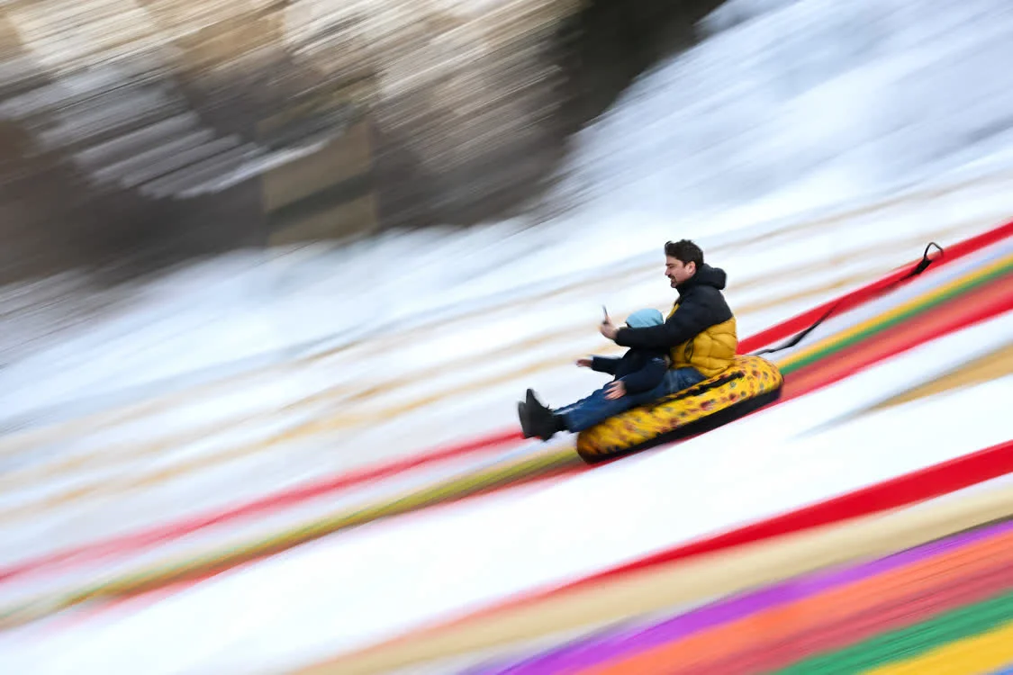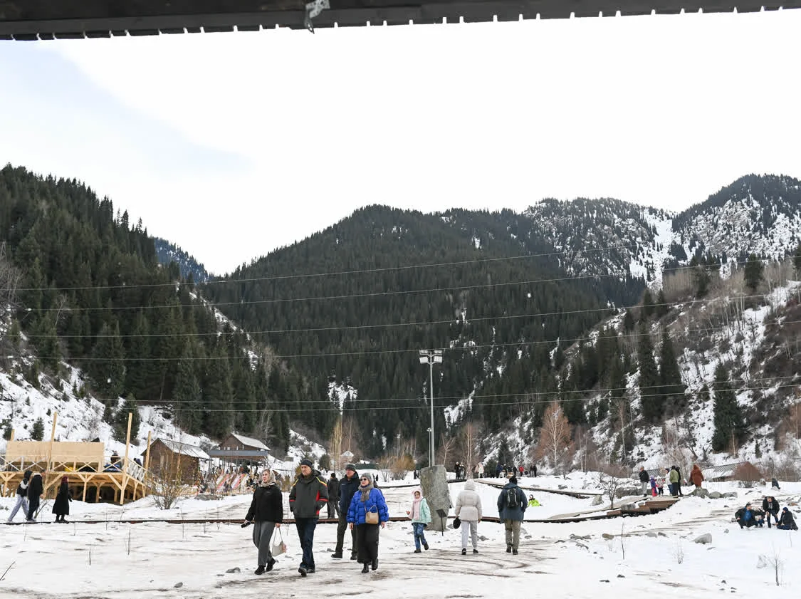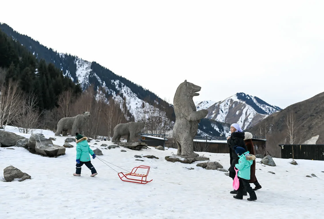 近日,哈萨克斯坦阿拉木图市郊山区被冰雪覆盖,人们纷纷到户外享受冬日雪趣。