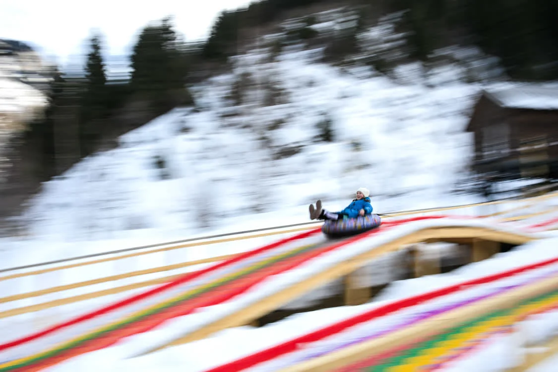 1月11日,在哈萨克斯坦阿拉木图市郊,一名儿童体验冰雪滑梯。新华社记者 李任滋 摄