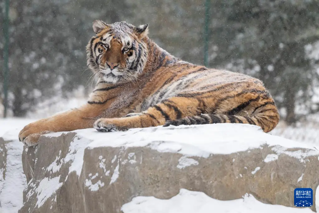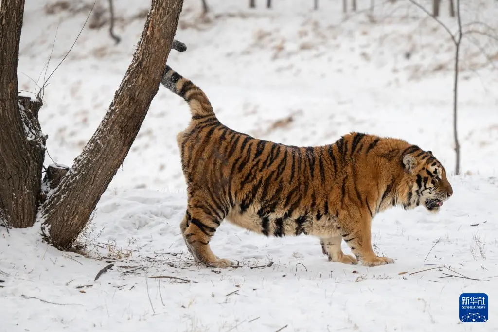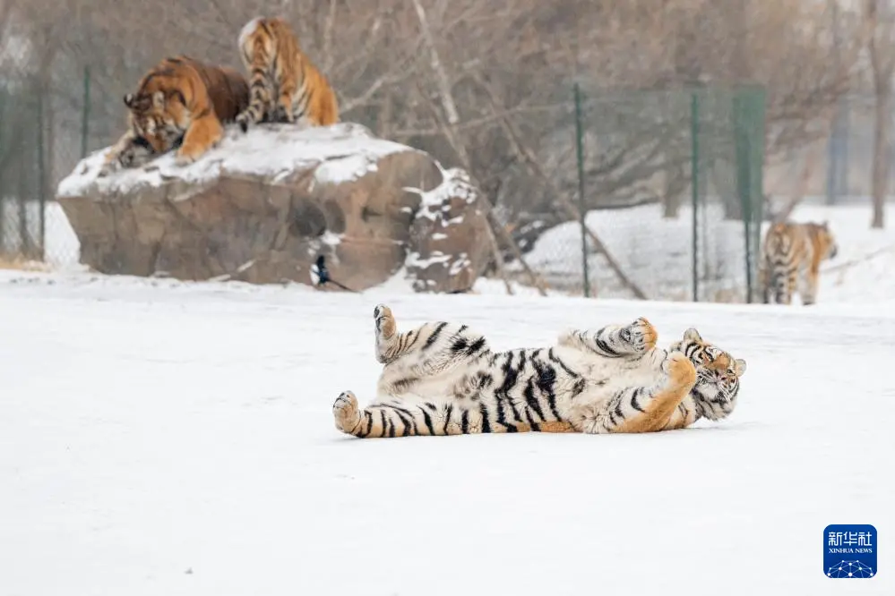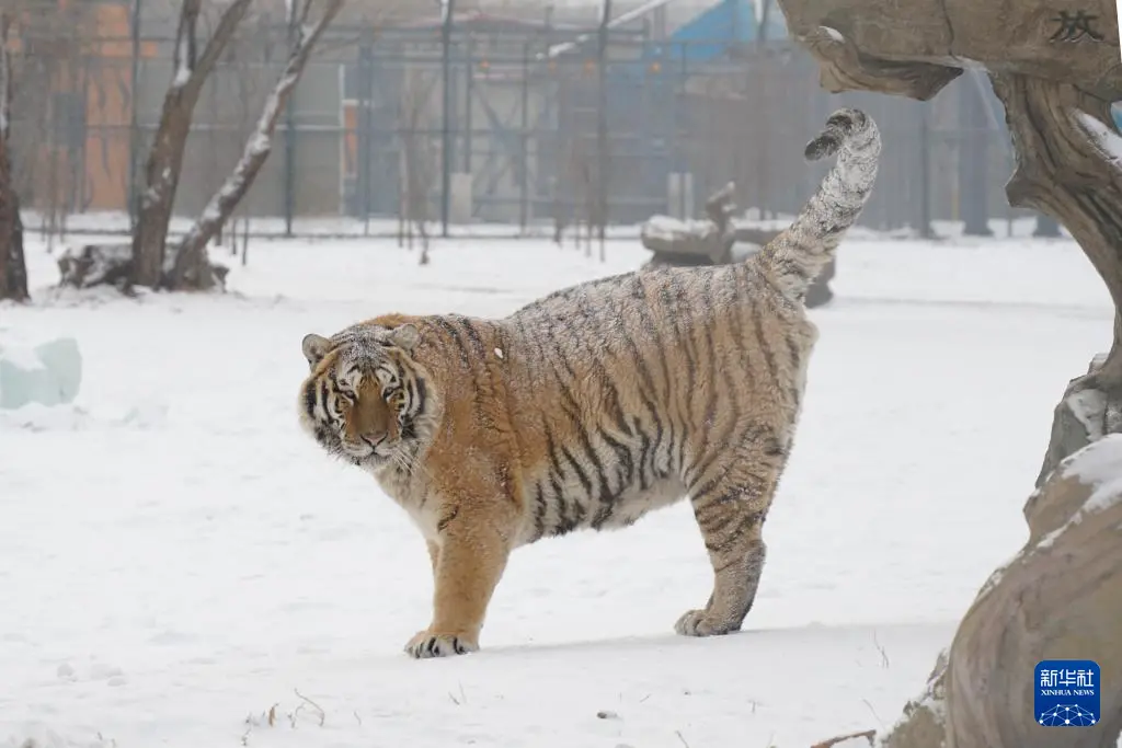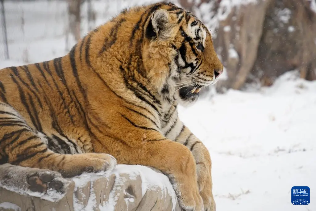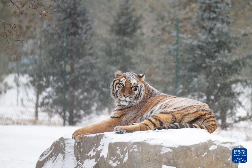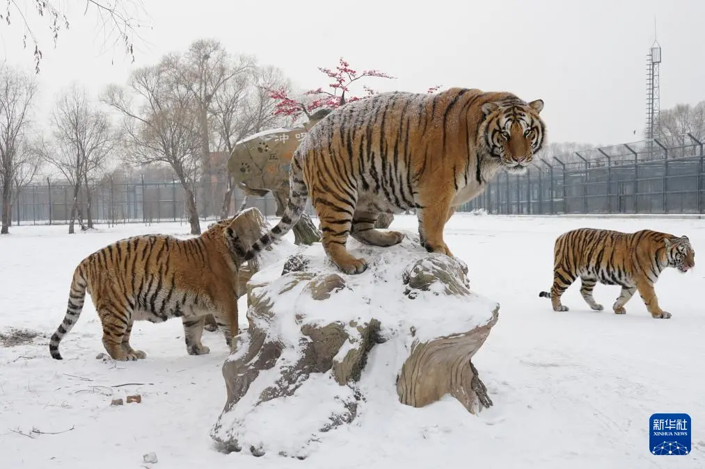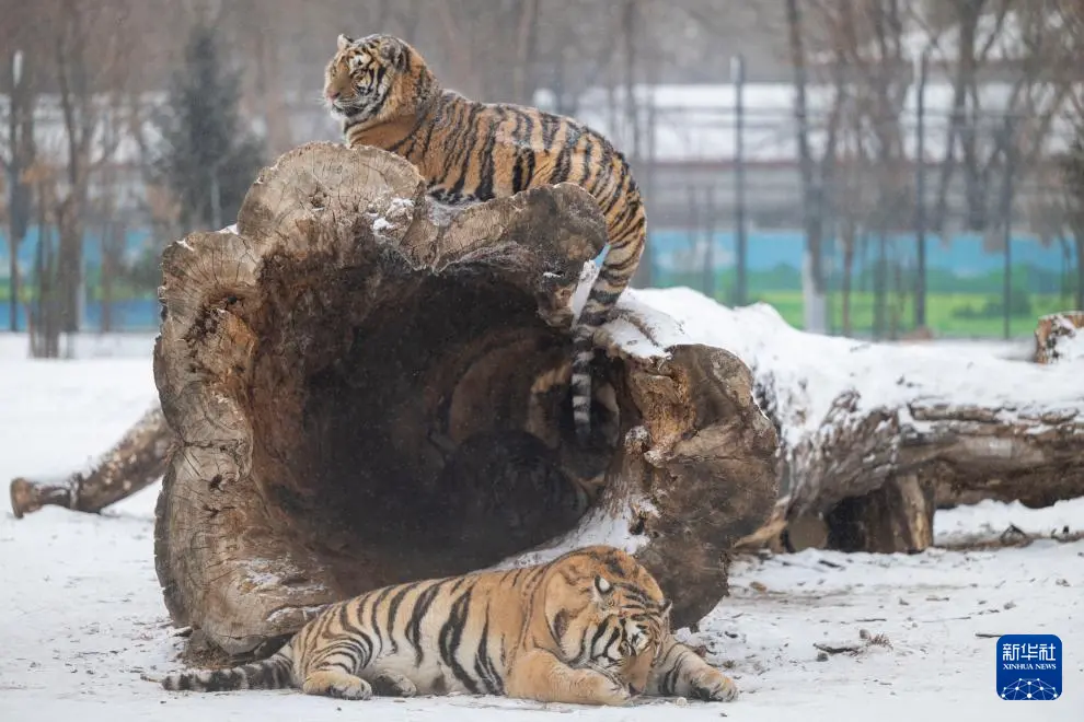 1月12日,冰城哈尔滨市迎来降雪天气,在黑龙江东北虎林园,散放区的东北虎在雪地活动。