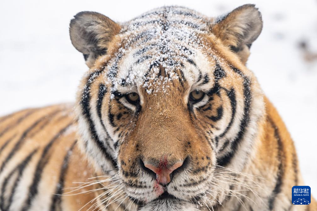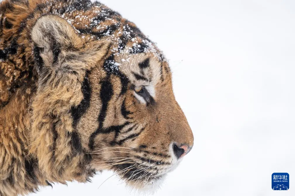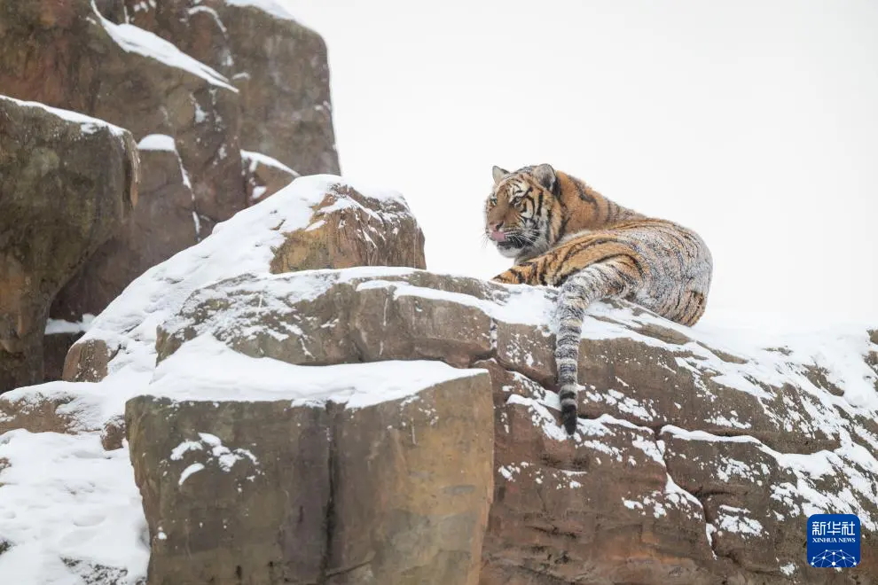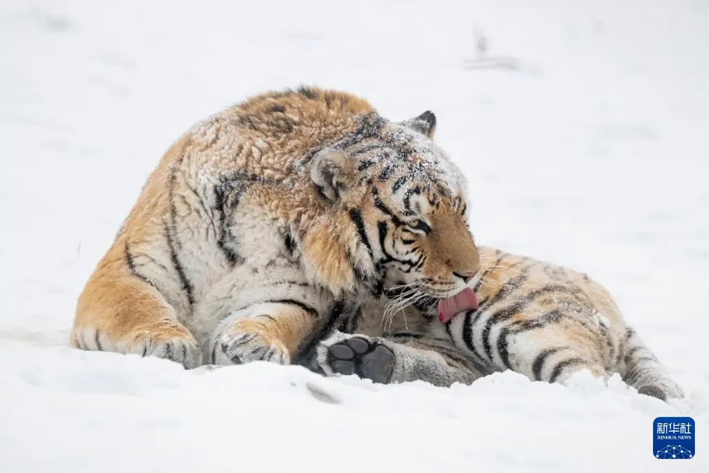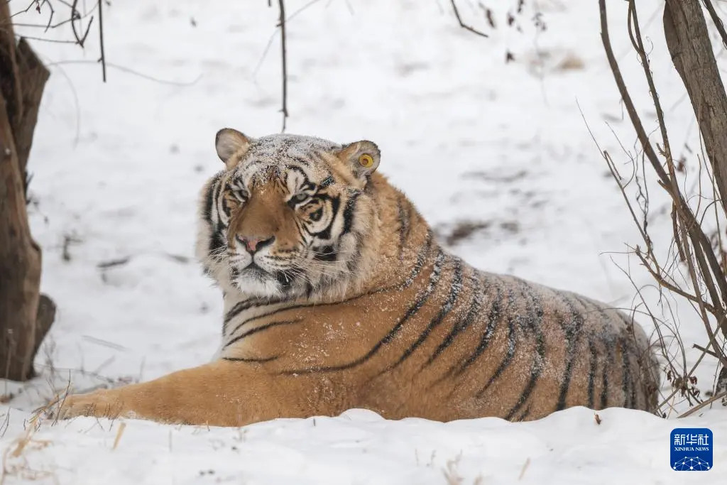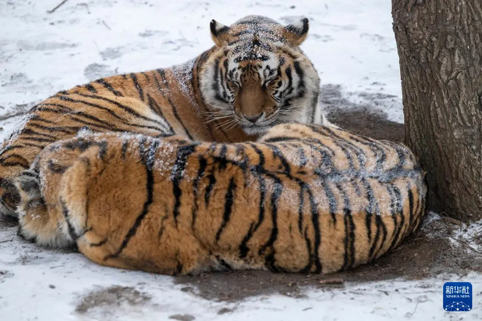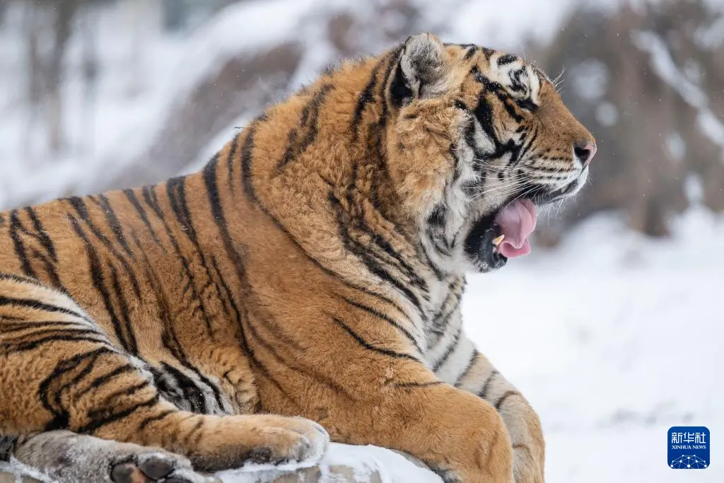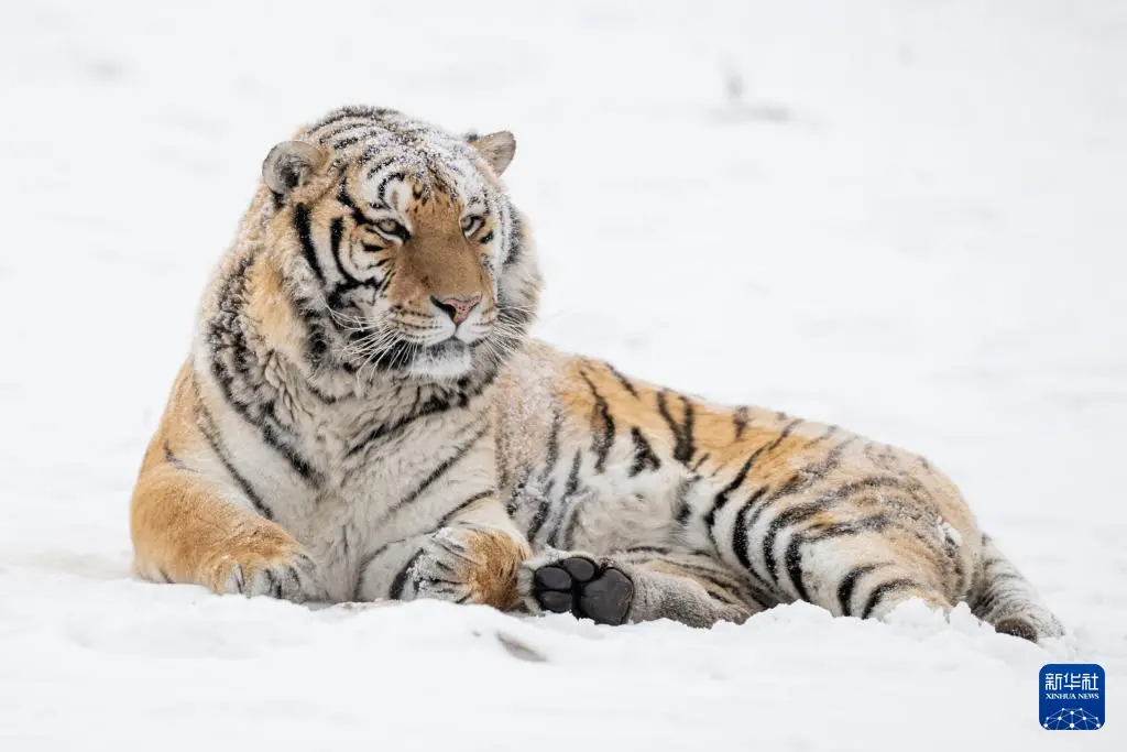 1月12日,冰城哈尔滨市迎来降雪天气,在黑龙江东北虎林园,散放区的东北虎在雪地活动。