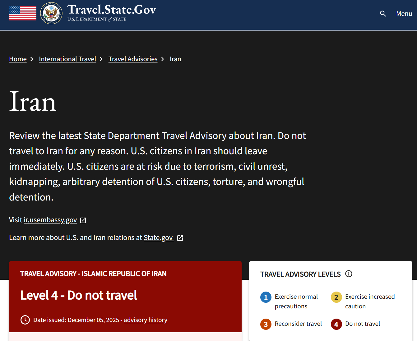 目前美国国务院针对伊朗发布的旅行警告也处于最严重的4级,即“不要前往”。美国方面还警告称,由于美国在伊朗没有设立大使馆,因此如果发生意外情况,美国公民将难以获得来自官方层面的协助。