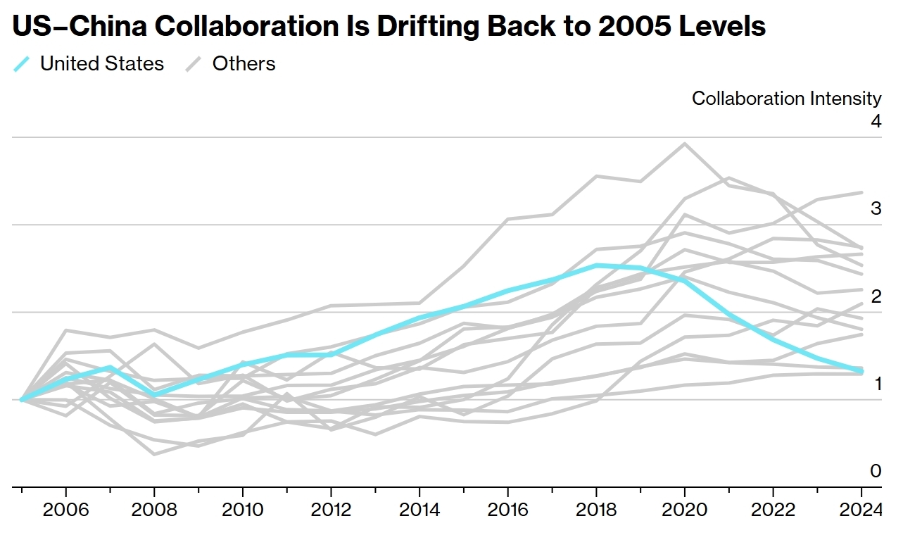 彭博社引述报告内容称,中美科研合作的下滑正始于“中国行动计划”的推出。如今两国在科技研究领域的合作已持续下滑至20年来最低水平,这一转变可能重塑对全球安全与经济增长至关重要的创新格局。