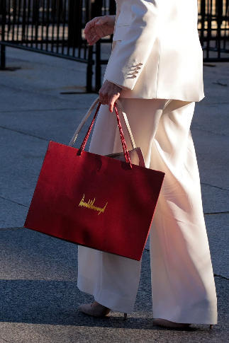 走出白宫后,马查多手拎红色礼品袋
