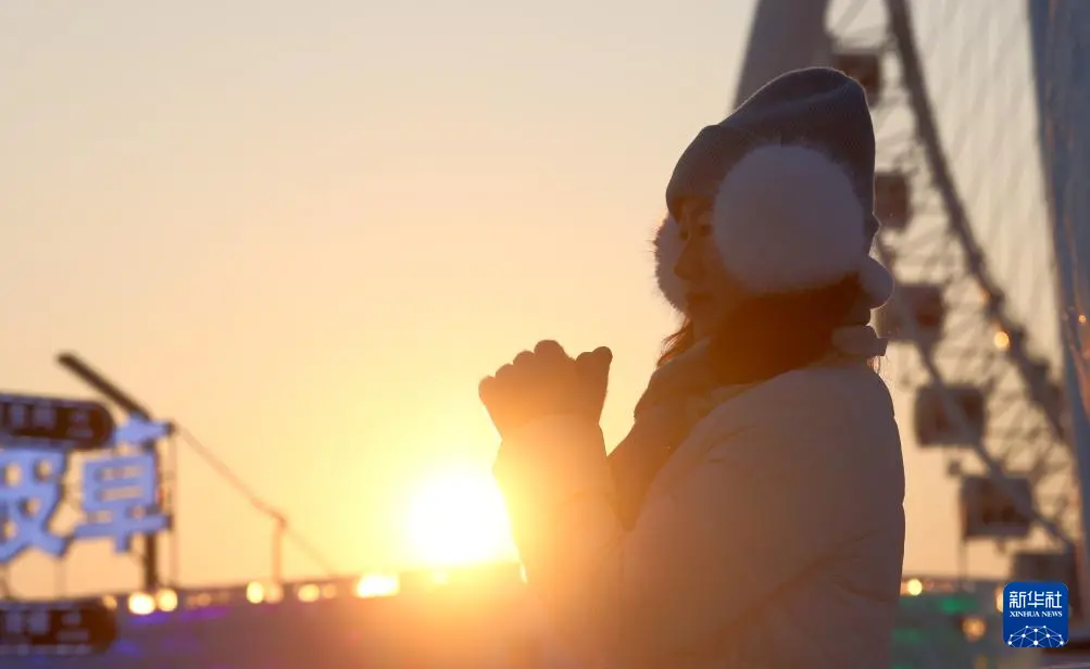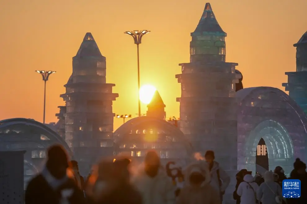 夕阳西下,落日余晖为哈尔滨冰雪大世界披上暖金霞光,游客尽享冬日的浪漫与温柔。