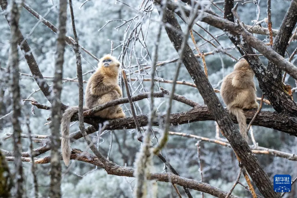 1月19日,两只金丝猴在神农架国家公园大龙潭金丝猴野外研究基地树枝上休憩。