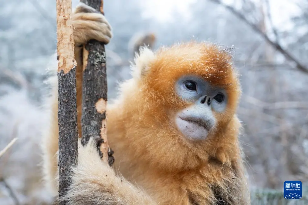 1月19日,一只金丝猴在神农架国家公园大龙潭金丝猴野外研究基地啃食树皮。