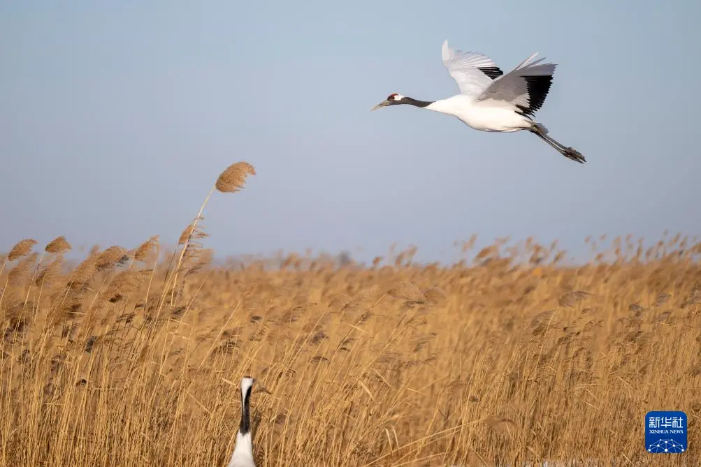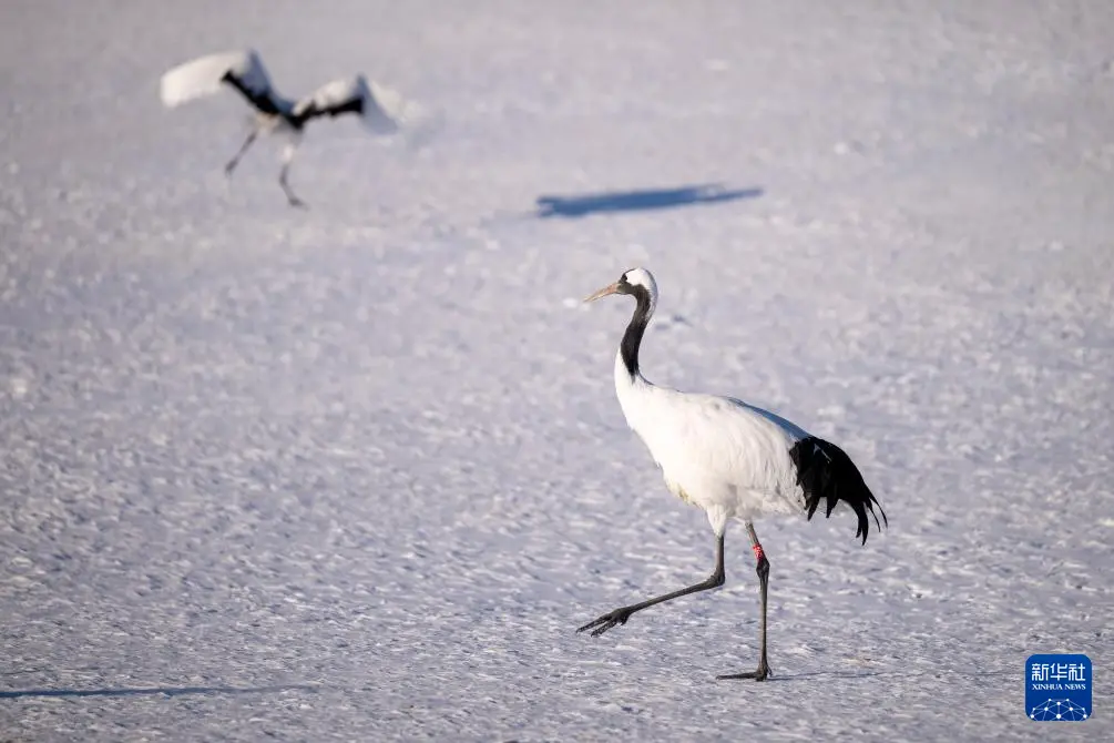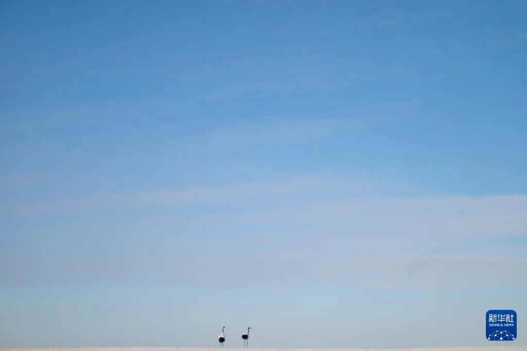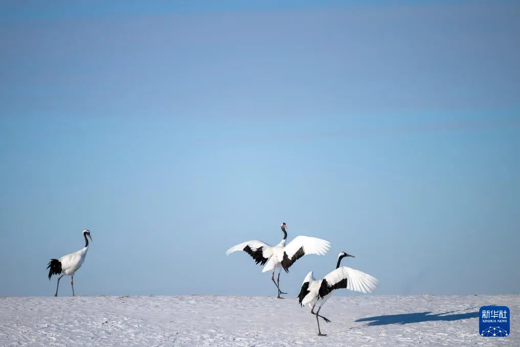 冬日时节,黑龙江扎龙国家级自然保护区内白雪皑皑,丹顶鹤在寒风中觅食,上演一幅鹤舞冬日的纯净画面。