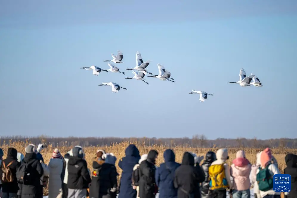 1月21日,游客在黑龙江扎龙国家级自然保护区内观看丹顶鹤。