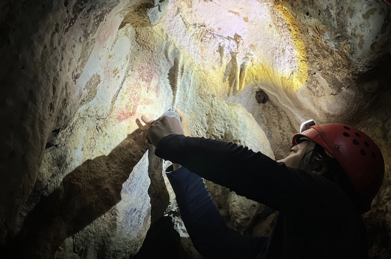 印度尼西亚科学家阿迪·阿古斯·奥克塔维亚纳正在印度尼西亚穆纳岛研究岩画。2015年,他在一幅早期洞穴壁画下方发现了一个古老的手印