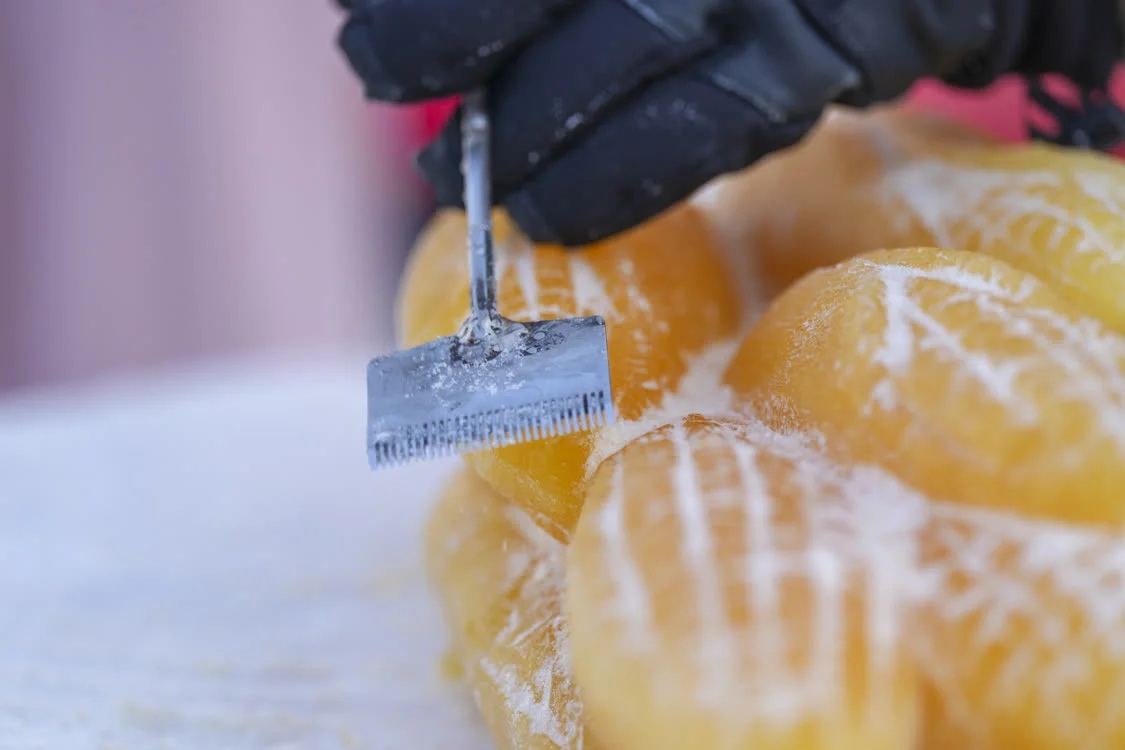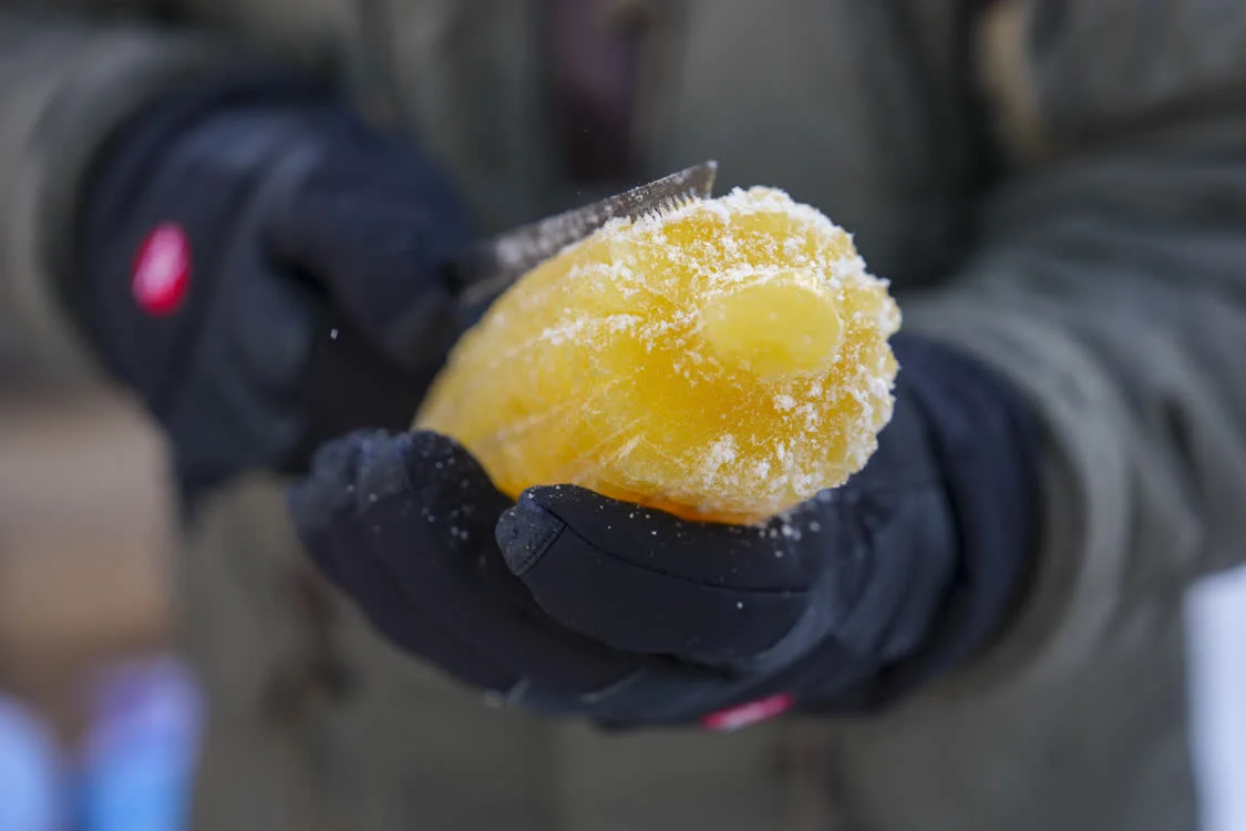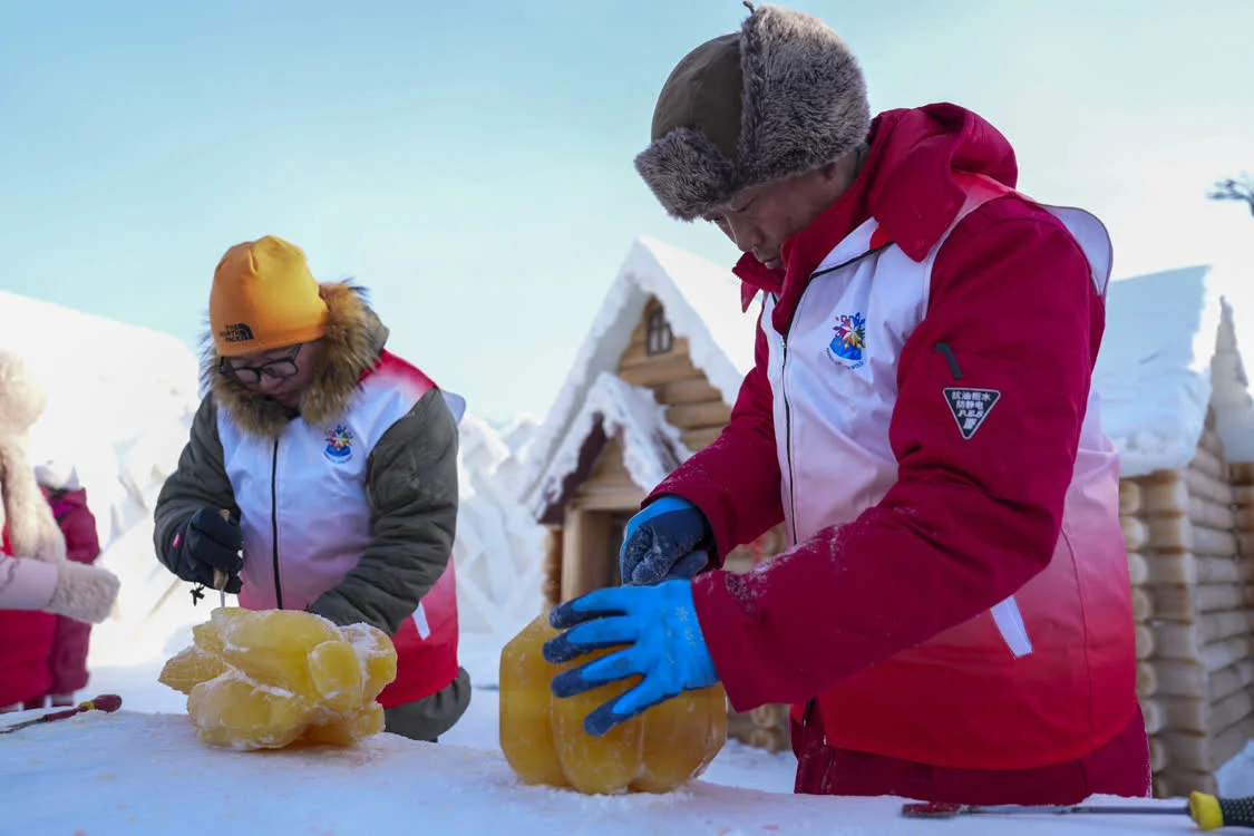 1月28日,第二十七届哈尔滨冰雪大世界的冰雕师使用植物彩色冰进行雕刻创作,为冰雕艺术带来崭新的视觉体验。植物彩色冰由哈尔滨冰雪大世界、东北林业大学和哈尔滨师范大学联合研发,以木粉、树叶、花草等为原料,从中分离出植物色素,经特殊工艺处理后再经冷冻加工制备而成,最终形成色彩斑斓的冰块。植物彩色冰色泽温暖柔和,具有良好的保色性,观赏效果持久稳定。待来年春季冰雪消融后,彩色冰将自然降解,实现“零负担”融入自然生态系统。