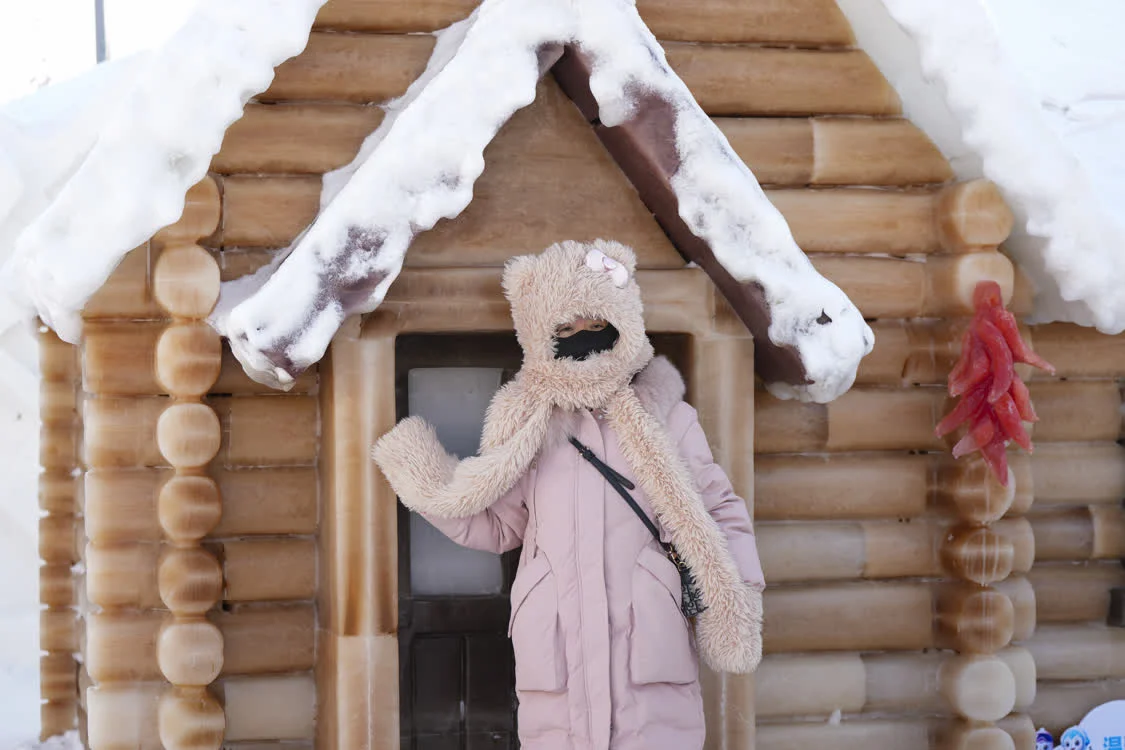 1月28日,参观者在第二十七届哈尔滨冰雪大世界园区中的植物彩色冰雕房屋前拍照。新华社记者 王松 摄