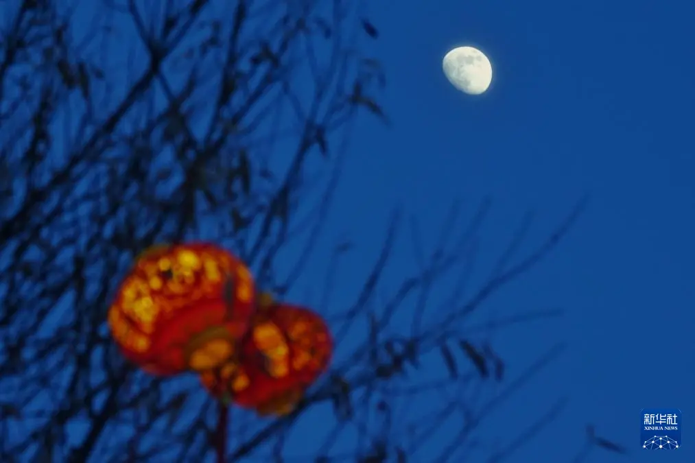 1月29日,在黑龙江省同江市,灯笼与月亮相映成趣。