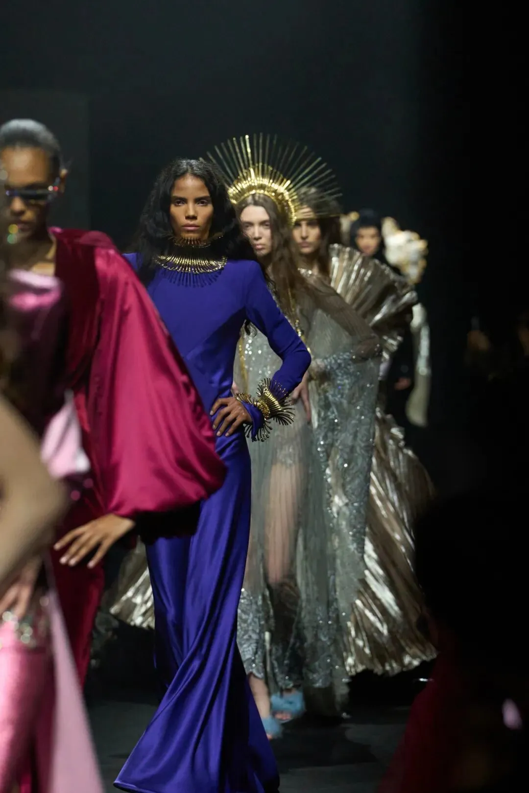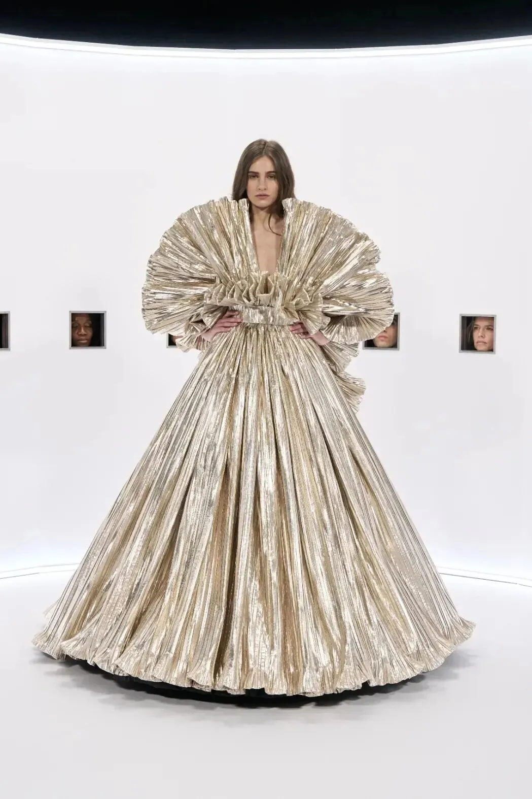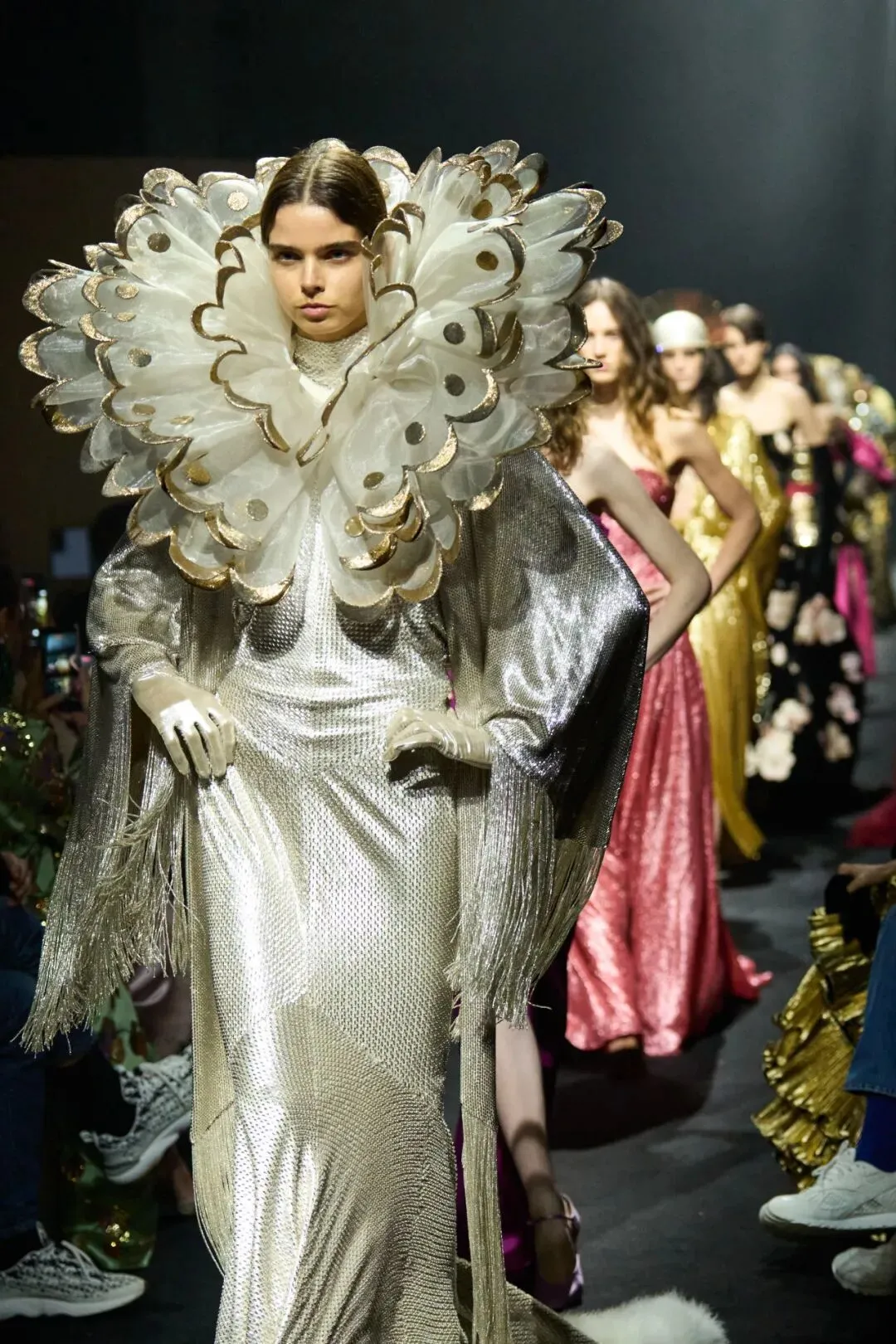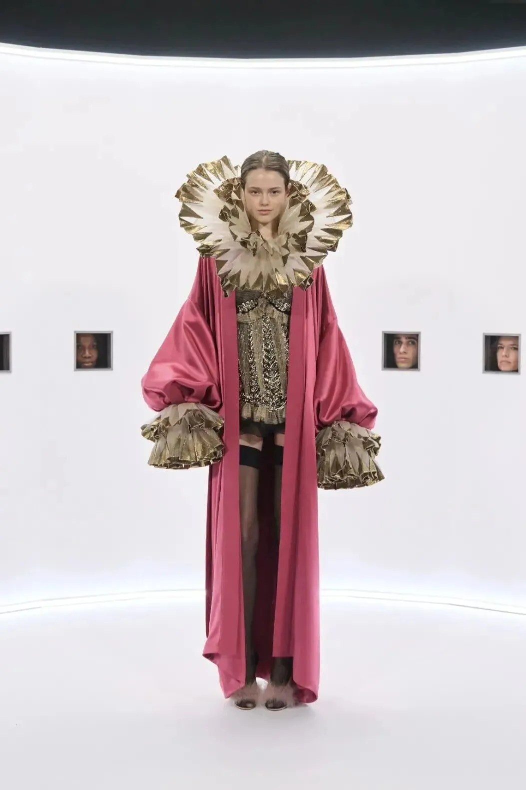 当夸张结构、巨型饰领与立体廓形开始压过身体本身,模特更像服装的支架而非主体。这里的高级定制不再以“穿着”为目的,而是明确地进入象征领域。