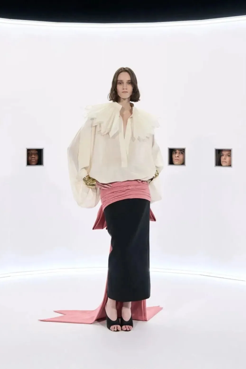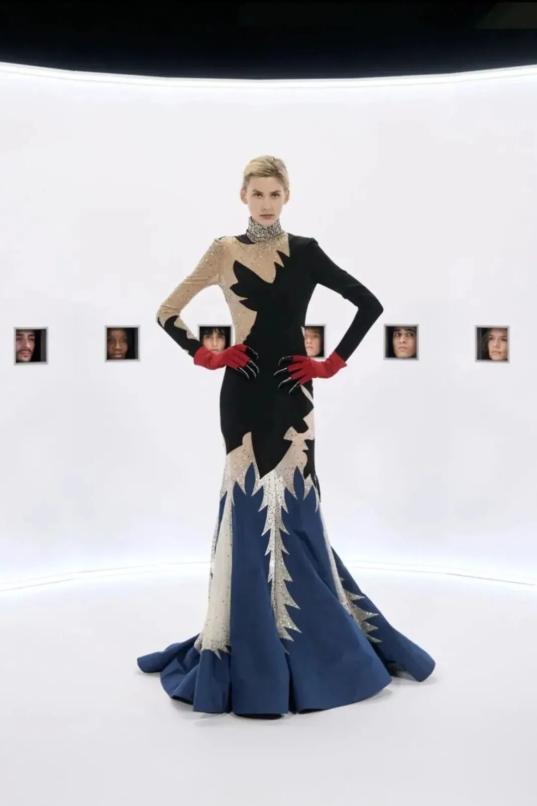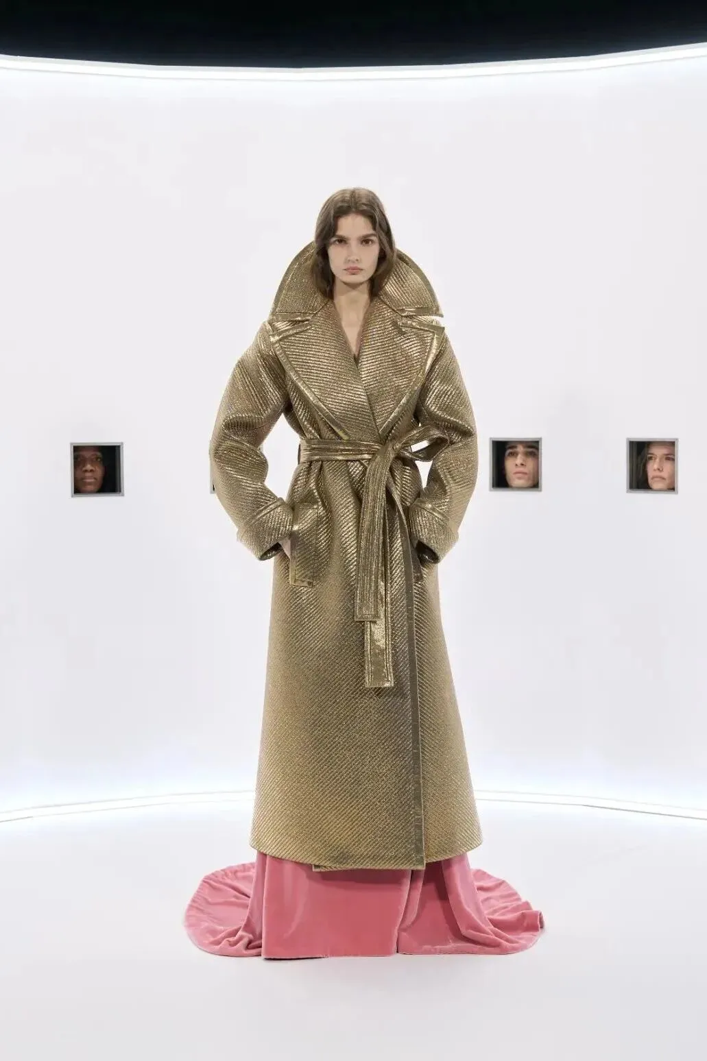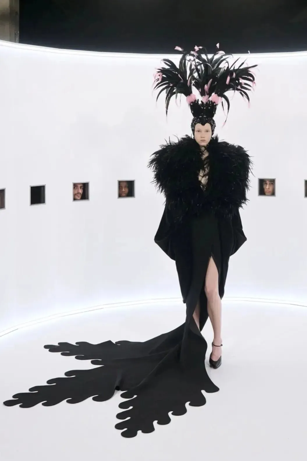 当夸张结构、巨型饰领与立体廓形开始压过身体本身,模特更像服装的支架而非主体。这里的高级定制不再以“穿着”为目的,而是明确地进入象征领域。