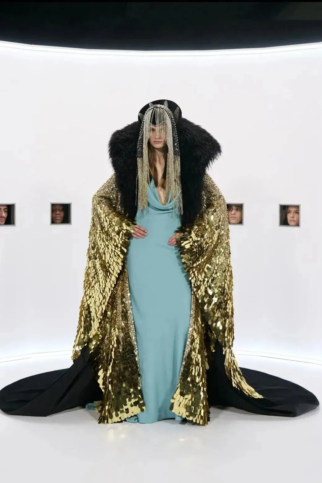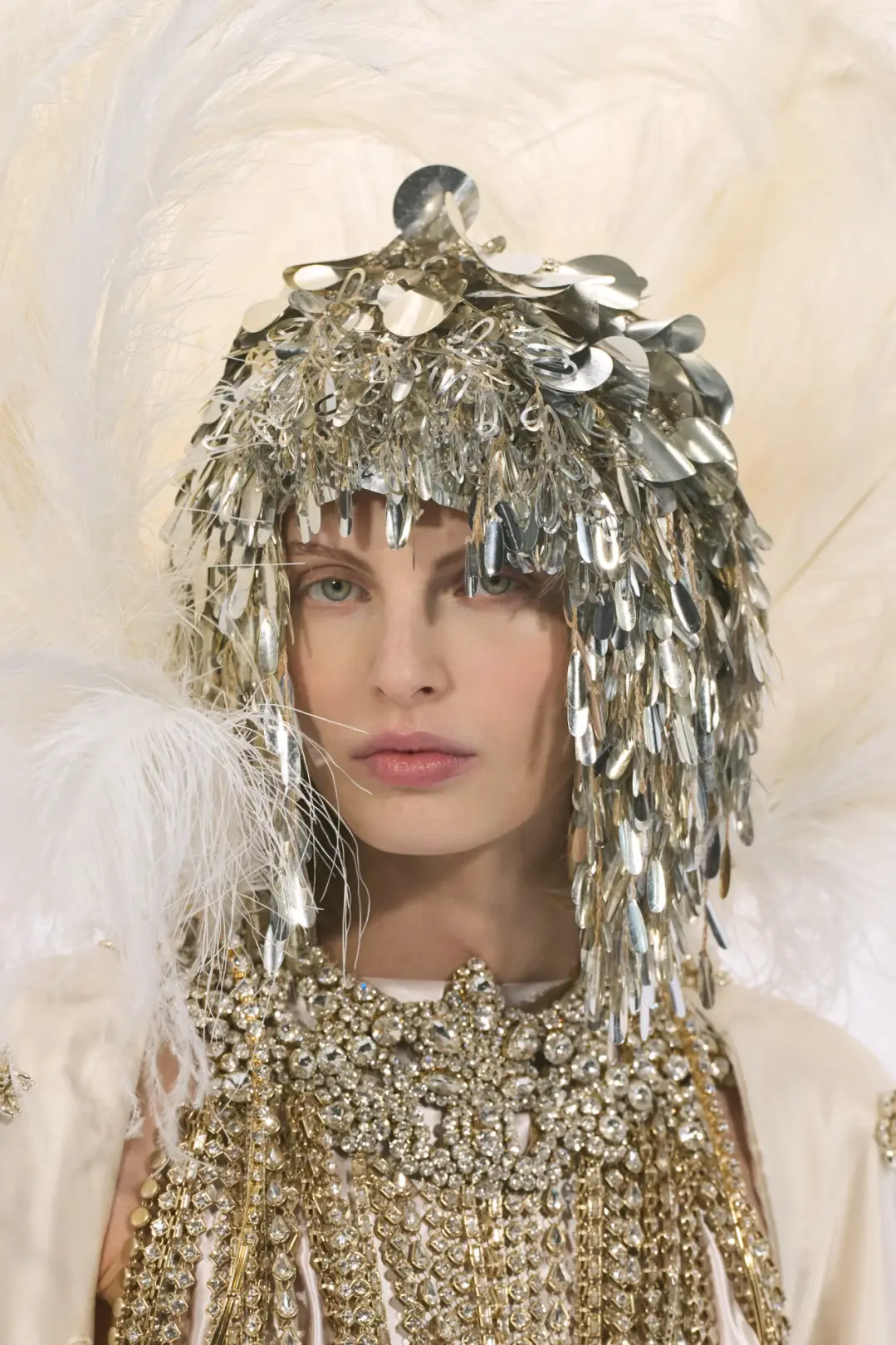 还有的造型以高耸羽饰和金属为核心,强调仰视视角,如祭司般庄严。服装的剪影克制而收敛,反衬头部装饰的仪式性重量。羽毛不被处理为轻盈之物,而是被组织成近乎建筑性的形态,使造型介于宗教加冕与戏剧登场之间,这是一个典型的权力与仪式性造型逻辑。