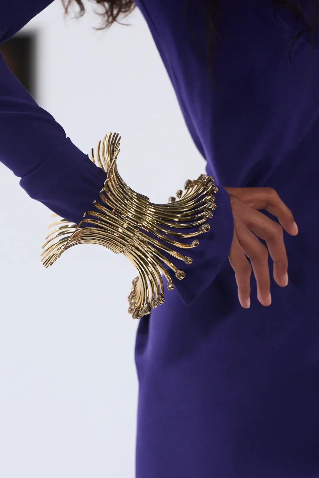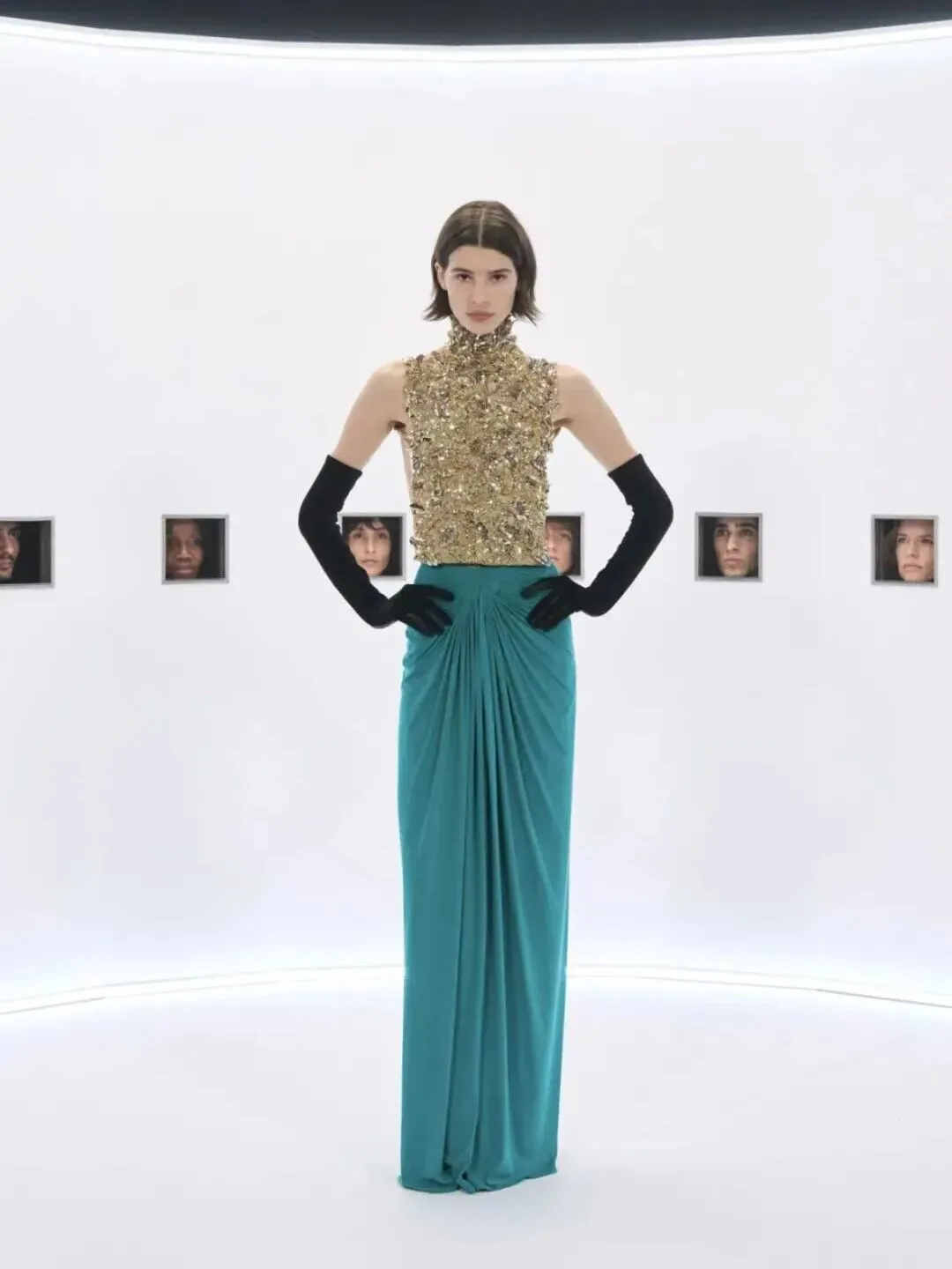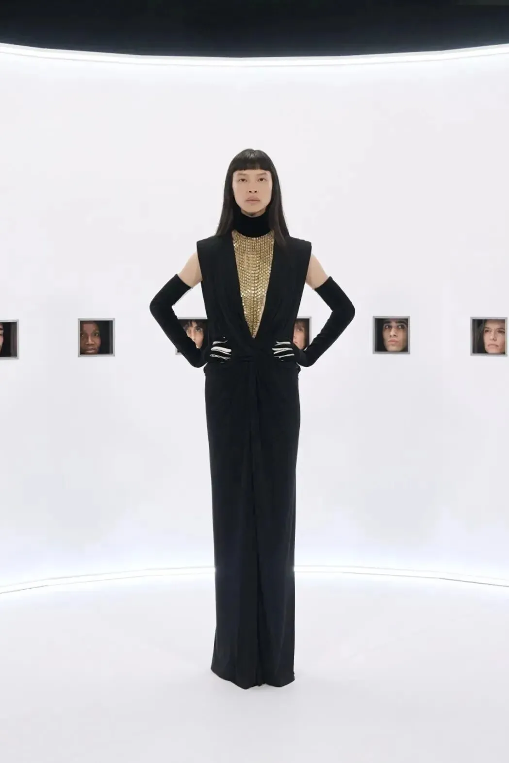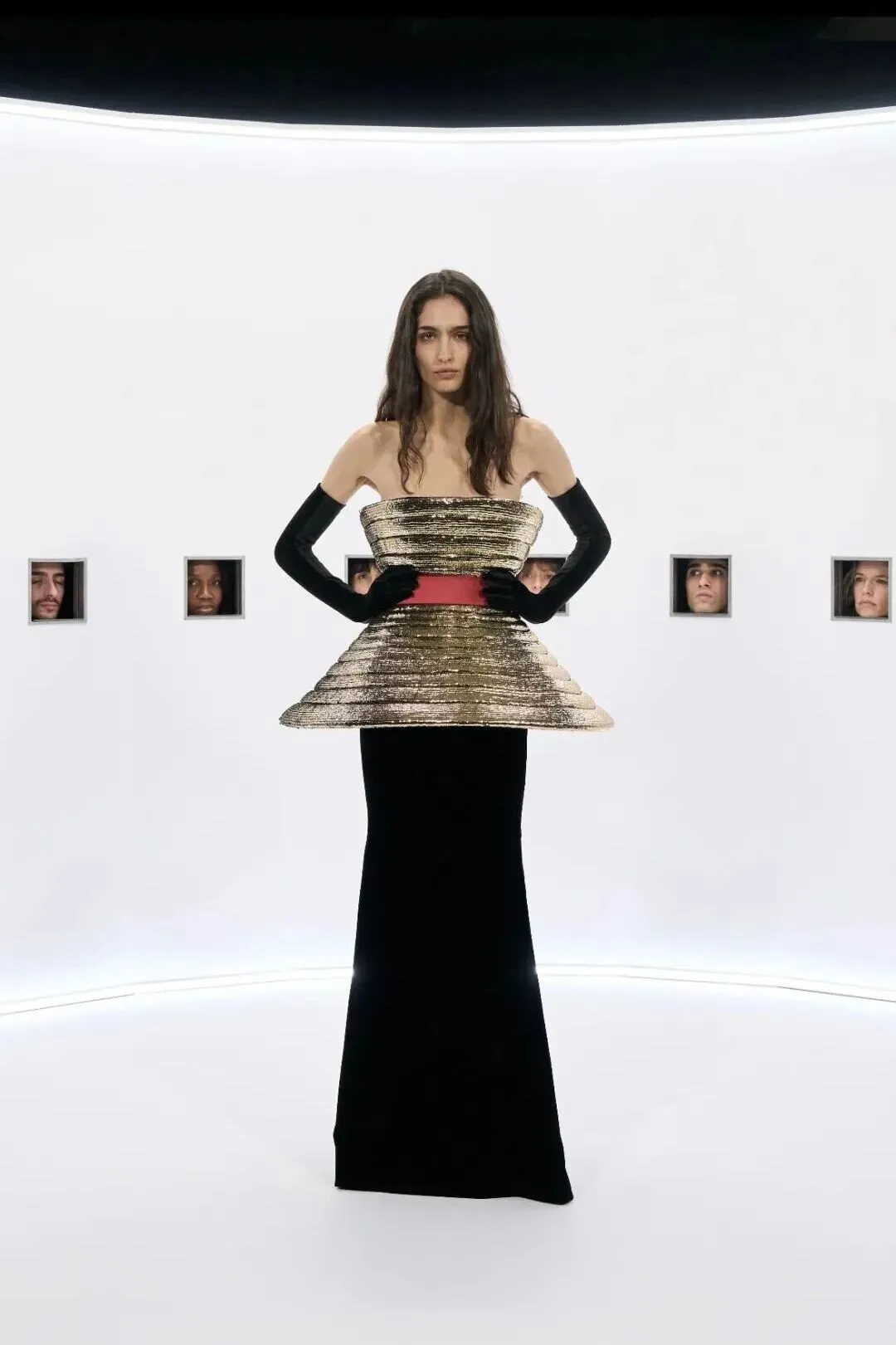 金色立体结构礼服被处理得接近金属质感,褶皱与立体结构共同制造出一种接近雕塑的重量感。在缓慢旋转的展示方式中,服装几乎不需要动作,仅凭光线变化就完成表达。