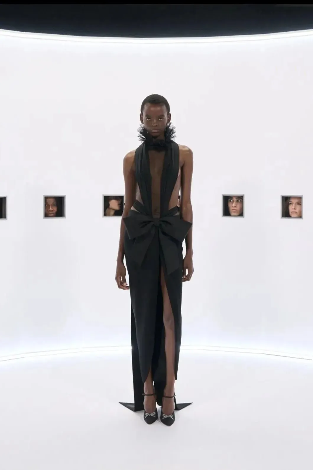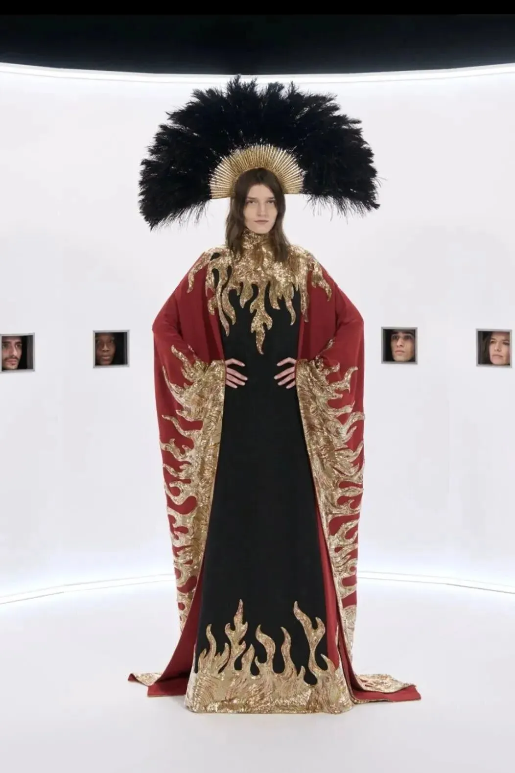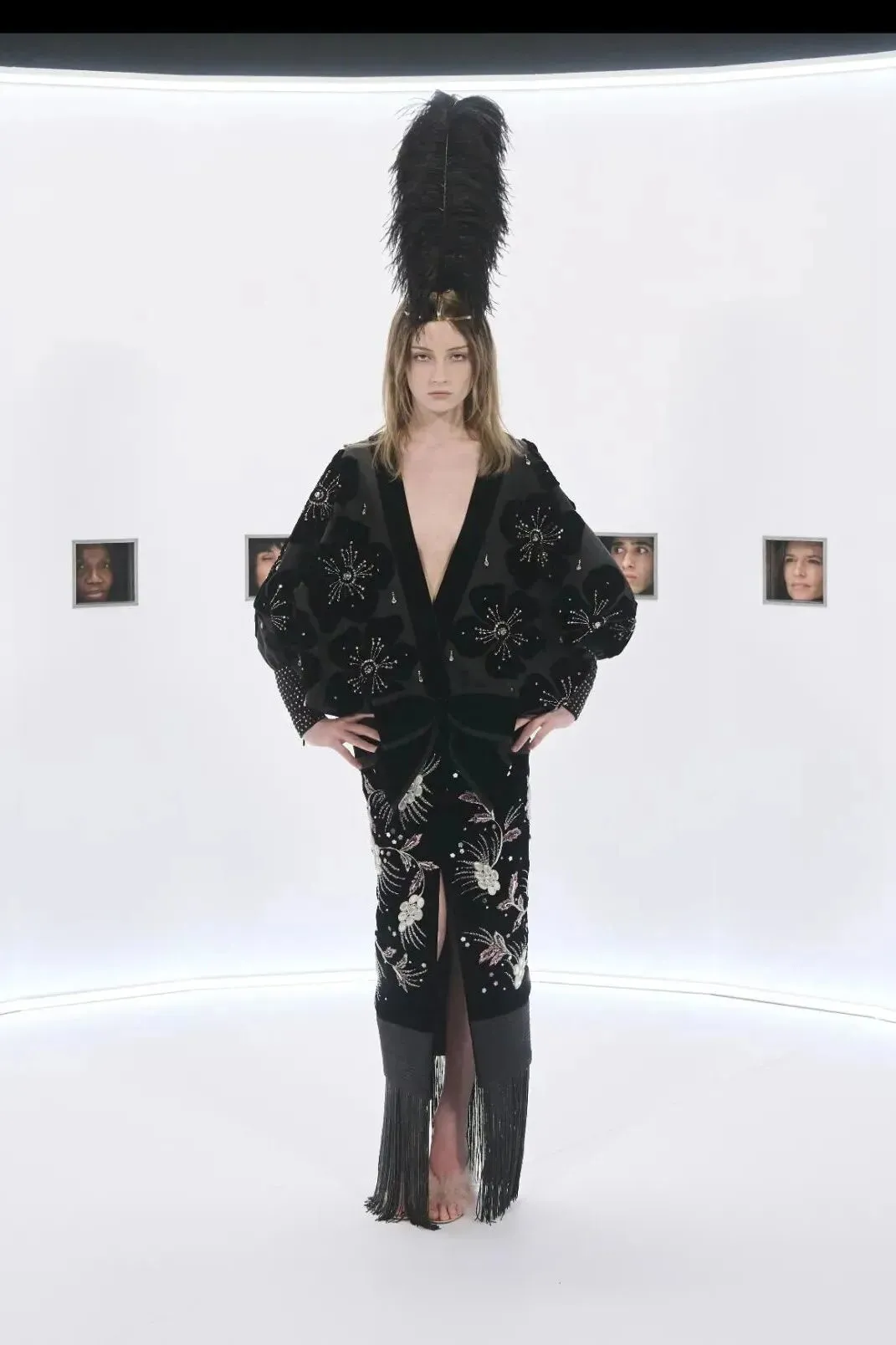 羽毛、夸张的饰领、艺术化的轮廓线条与影像感刺绣,使身体逐渐退后,形象本身走到前景。这是一种明显区别于传统 Valentino 优雅路径的审美转向,更原始、更野性,也更象征性,都让人联想到1930年代好莱坞黄金年代影片中那些荧幕形象。