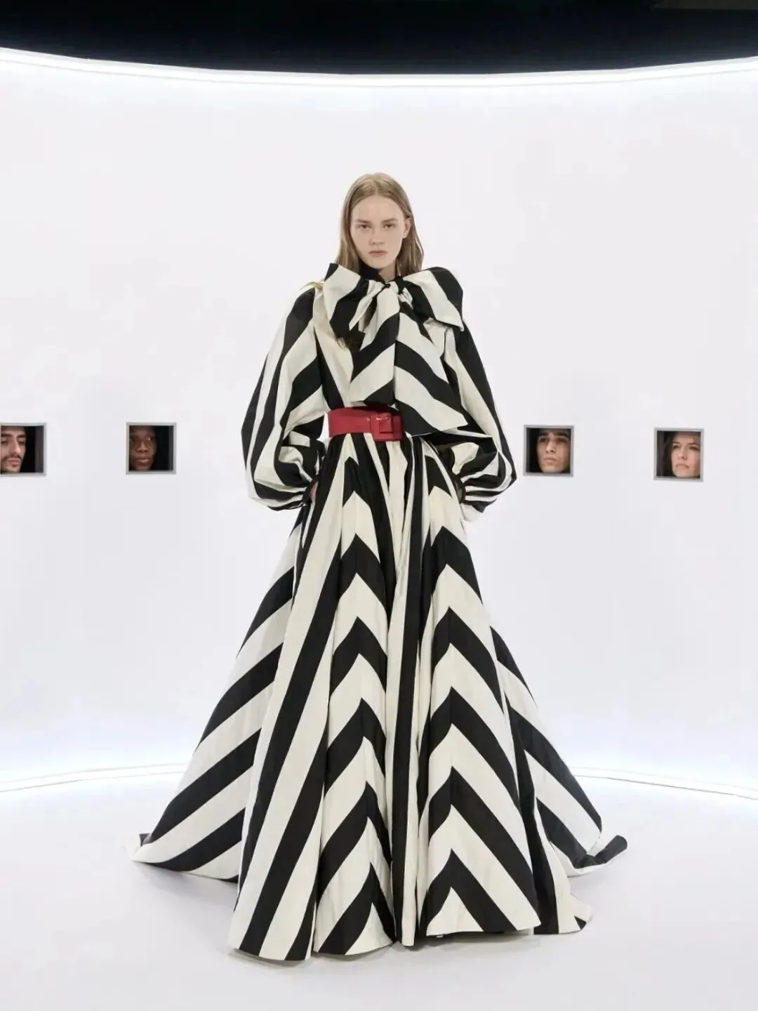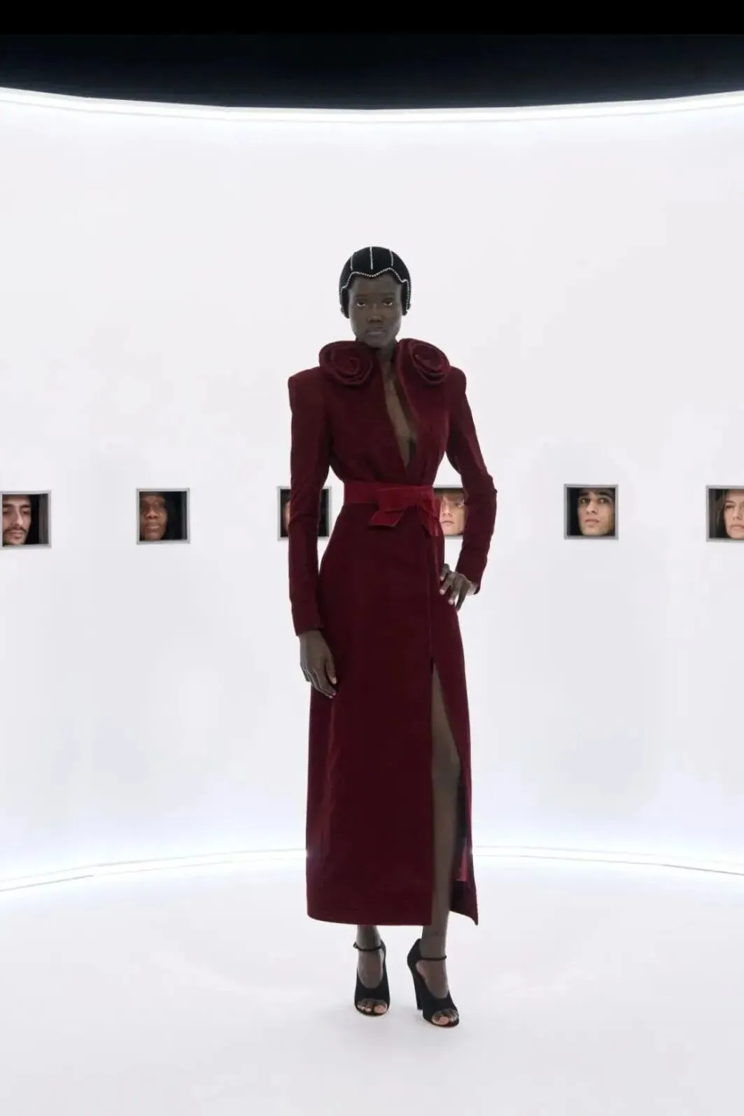 时装秀以Matt Tyrnauer 的纪录片《Valentino 最后的皇帝》片段作为开场,在片中,这位设计师在2008年即将退休之际,回忆起自己对旧好莱坞电影的热爱,这一声音成为整个系列的情绪底色,也直接成为系列叙述的核心灵感之一——电影是时装叙事与视觉神话的源泉。不是为了指向某一部具体电影,而是确立一种电影式的观看语感。