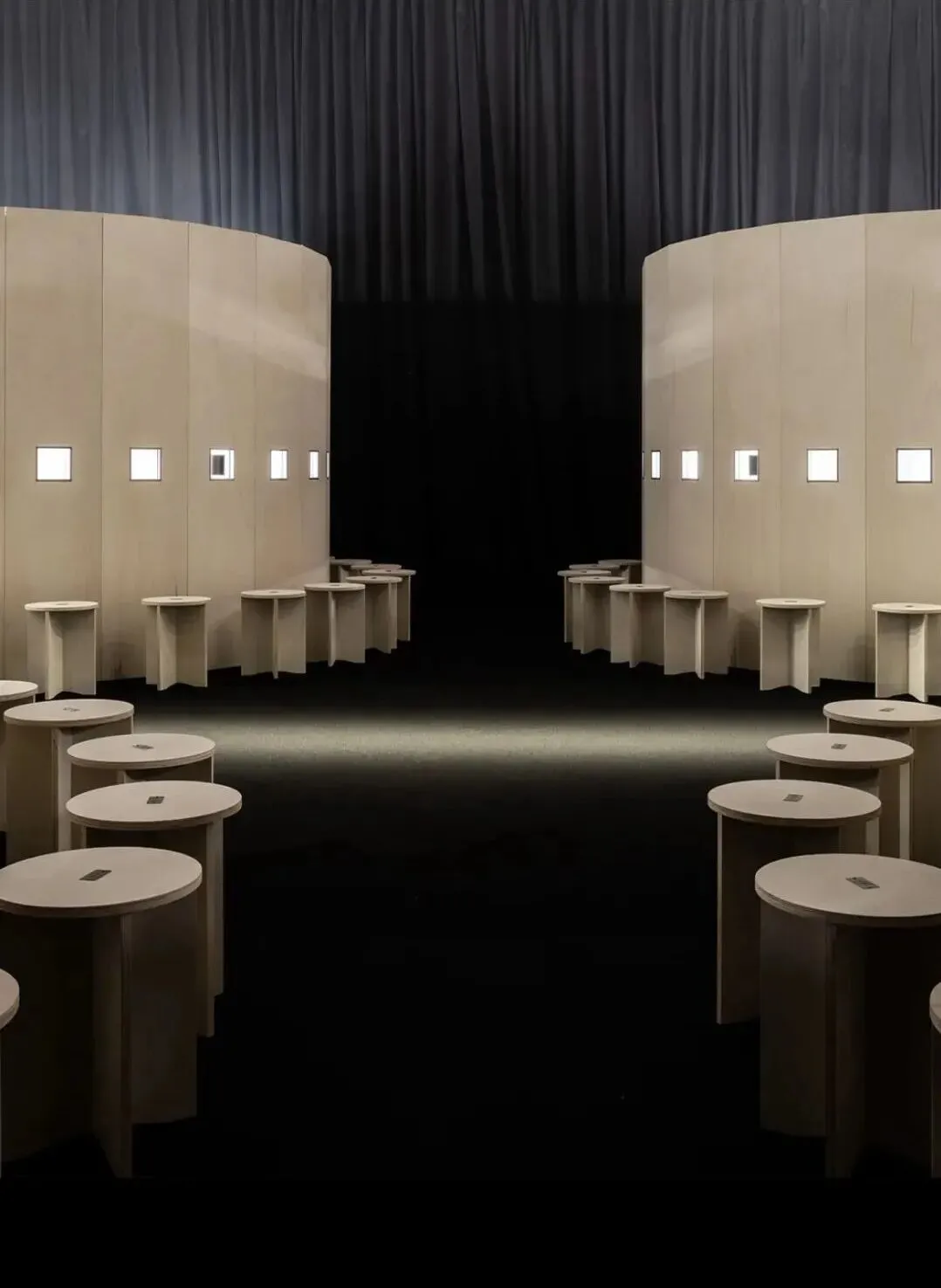 观众不再面对T台,而是透过狭小的窥视孔窥视缓缓到来的模特,时间被延迟,视线被压缩,慢镜头的节奏、明星出场的仪式感、影像在光影中出现又消失的神秘性,被转译为服装的呈现方式。观众与服装之间形成“窥视—被窥视”的张力。