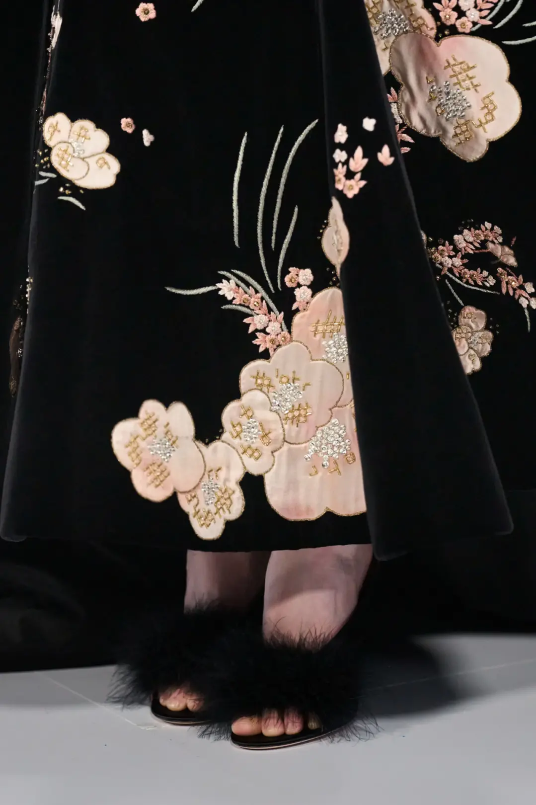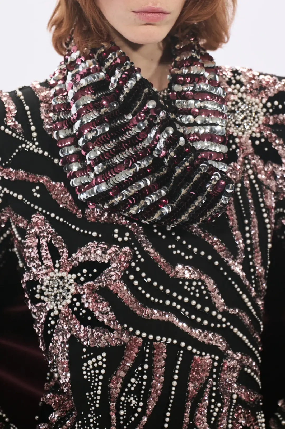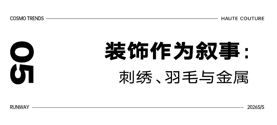 工艺在这一季中被明确推向“可见性”的层面,使高级定制的价值不再隐匿于内部。刺绣的重复与堆叠制造出影像般的颗粒感,密集的手工图案覆盖大面积布料,形成一种几乎具有声响感的视觉密度。