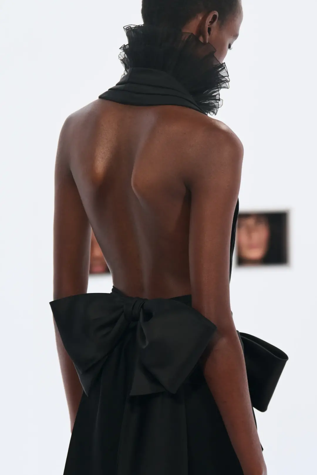 黑色连衣裙让人联想到上世纪10年代的Paul Poiret。高精剪裁下的柔软面料勾勒出曼妙线条如水般丝滑垂坠。收腰露背的设计使整体造型包裹但不过于裸露,有种Belle Époque 式的禁欲张力,延续了Valentino 刻在骨子里的优雅框架。