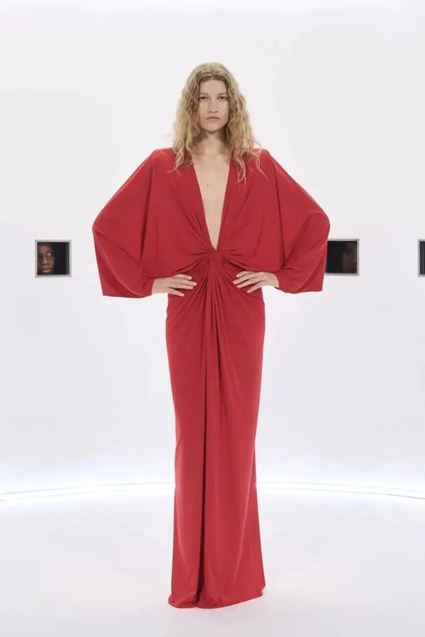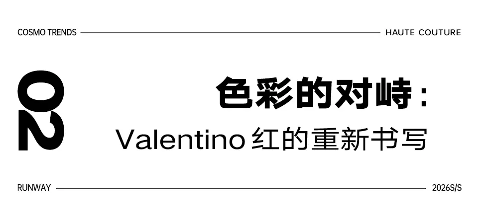 大秀以80年代Valentino红的经典造型拉开了帷幕。红色被处理得极为克制,没有戏剧性地爆发,只有一如既往的优雅。披肩结构模糊了肩线与手臂的界限,使红色不再是强调轮廓的工具,而是一种覆盖身体的情绪层。