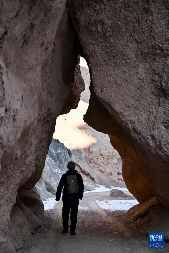 1月30日,在哈萨克斯坦阿拉木图州,一名游客在恰伦峡谷游玩。
