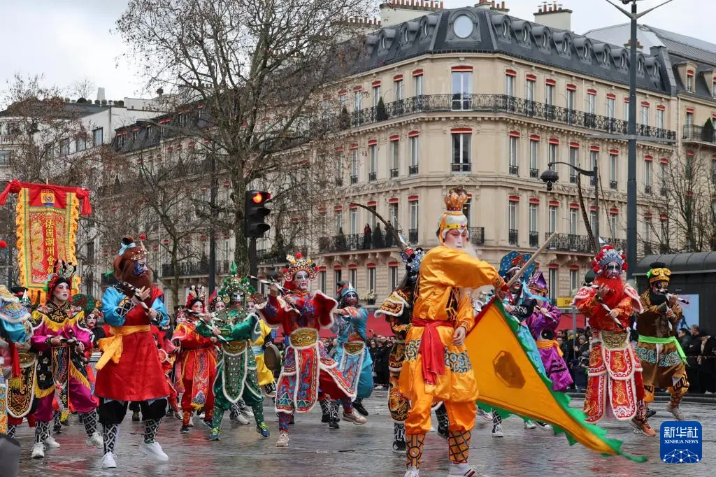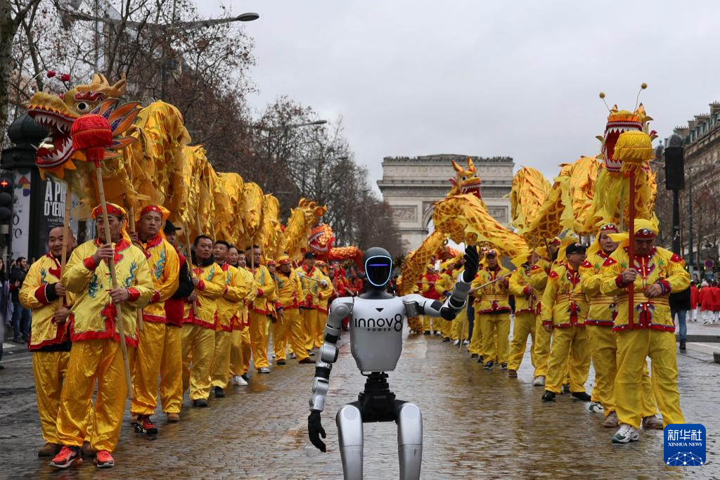 1日下午,由机器人引领的春节巡游表演方阵走上法国巴黎香榭丽舍大街,紧随其后的是舞龙舞狮、民族舞等传统表演,吸引了大街两侧的巴黎市民和游客驻足观看。在喜庆的锣鼓声中,法国这条地标性大道进入“春节时间”。
