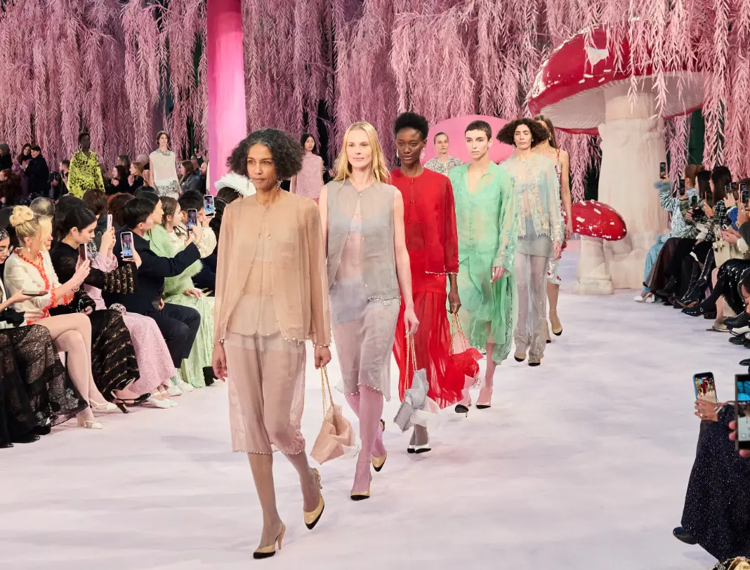 在由粉色垂柳与巨型蘑菇构建的“超现实森林”里,最引人瞩目的除了华丽的服装,还有以开场的“银发模特”Stephanie Cavalli为首的一众“超龄模特们”。