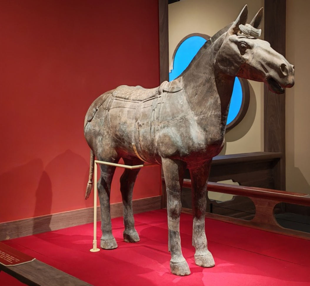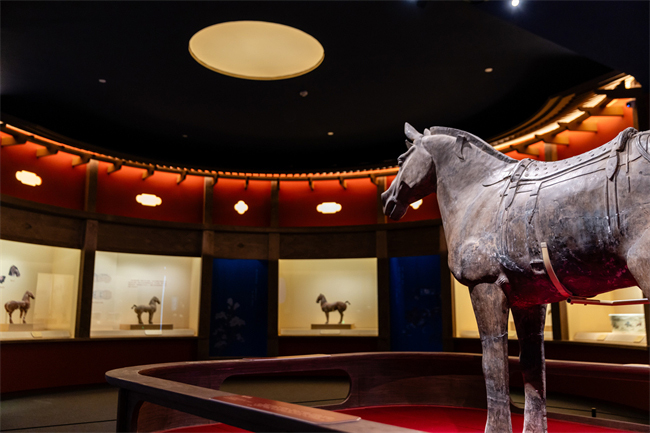 展出的一件东汉青铜轺车,是仪仗队列的前导车,显示马在古人的礼制生活中扮演着重要角色。