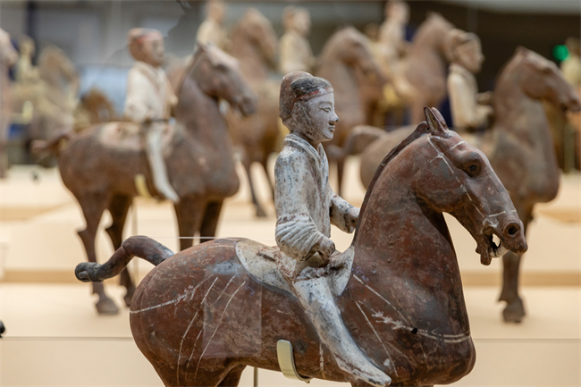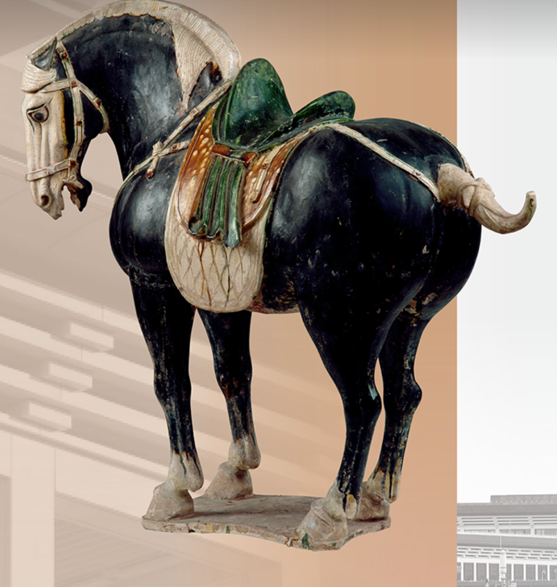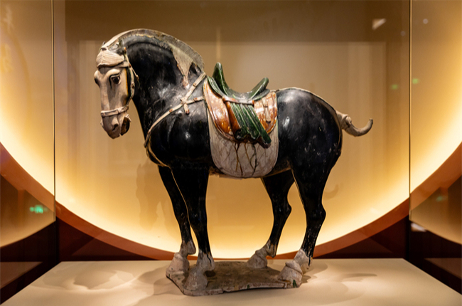 展品中,一件出土于河南洛阳关林的唐代三彩黑釉陶马尤为引人注目。此陶马一改秦汉时期平稳古拙的风格,展现出高昂彪悍的生动姿态。此展品也是国博的镇馆之宝之一。