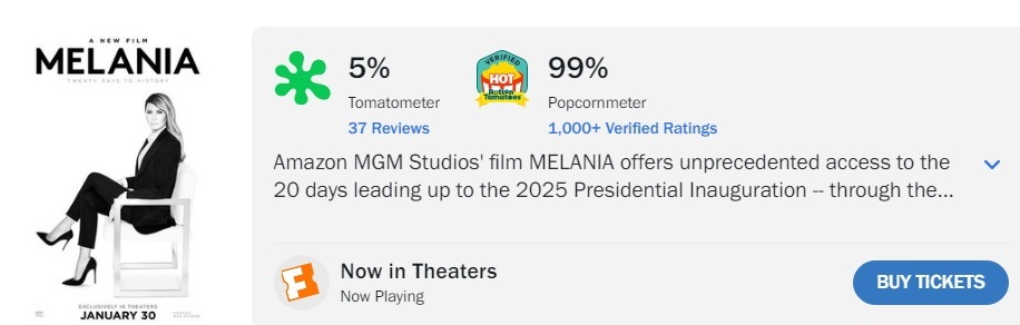 不过,再看一下公众意见,却完全是另一种风景。该片的“烂番茄”观众打分,目前是高达99%的新鲜度。还有专做影院观众口碑调查的CinemaScore和PostTrak两家平台,调研出来的观众口碑,也分别是A级和满分5分。当然,本身会在大冬天专程买票去看这部纪录片的,相信绝大多数也是支持共和党与特朗普的美国民众,所以《梅拉尼娅》能有这样的观众评价也在情理之中。而该片两极分化的口碑也正是美国社会当下严重撕裂的缩影。
