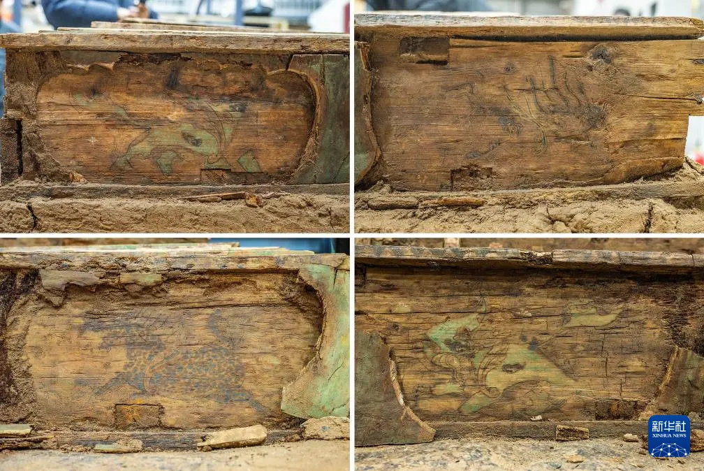 拼版照片:这是在实验室考古方舱内拍摄的墓葬M20出土棺座上壸门内的彩绘“瑞兽”图案(2月1日摄)。
