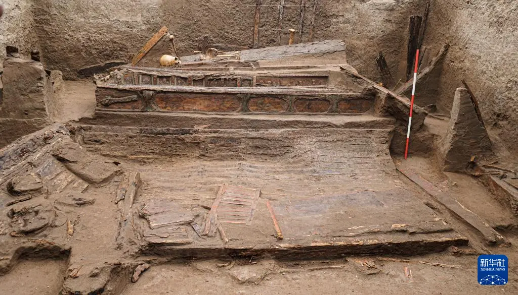 墓葬M20经初步揭露时墓内木榻和彩棺等的陈设布局情况(资料照片)。
