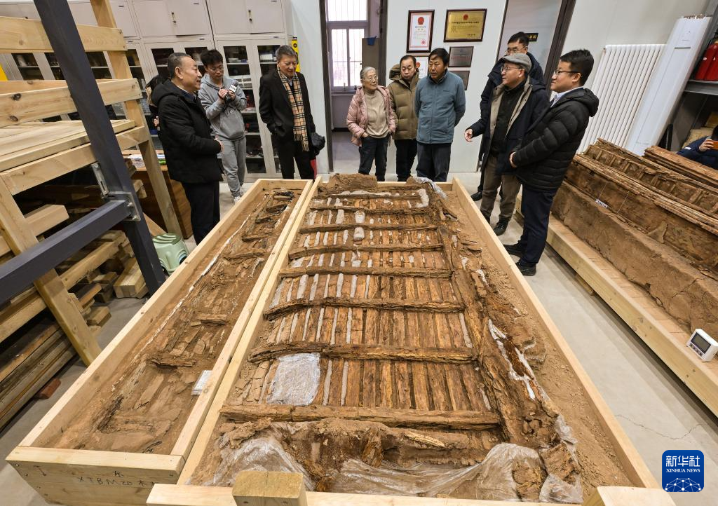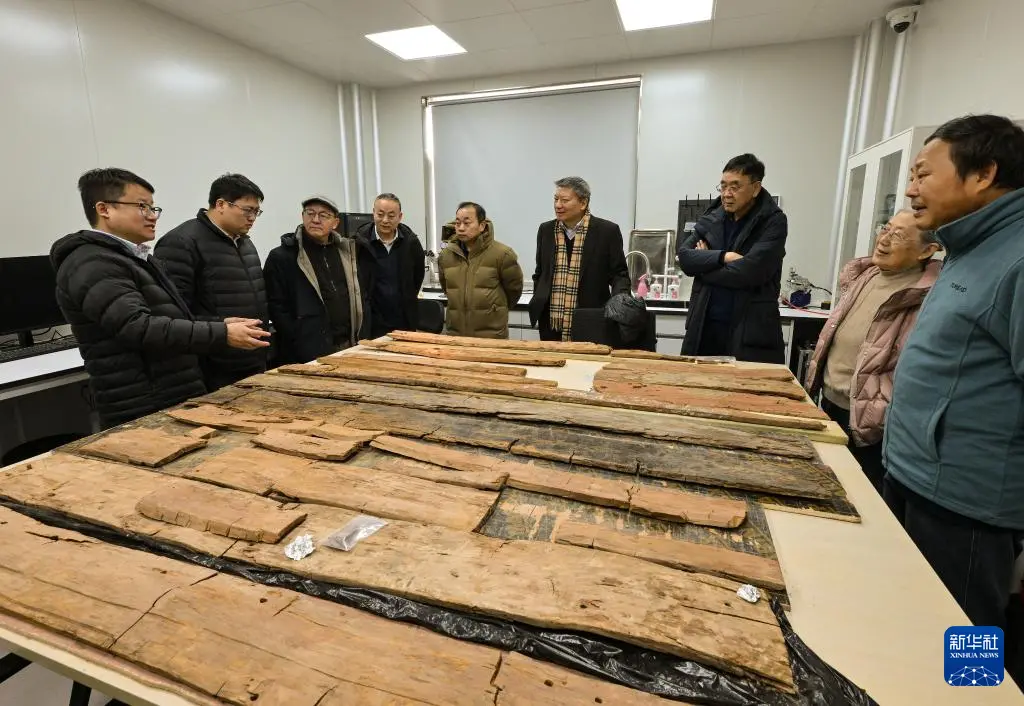专家们在实验室考古方舱内察看墓葬M20出土的带有彩绘和文字的木屏风(2月1日摄)。
