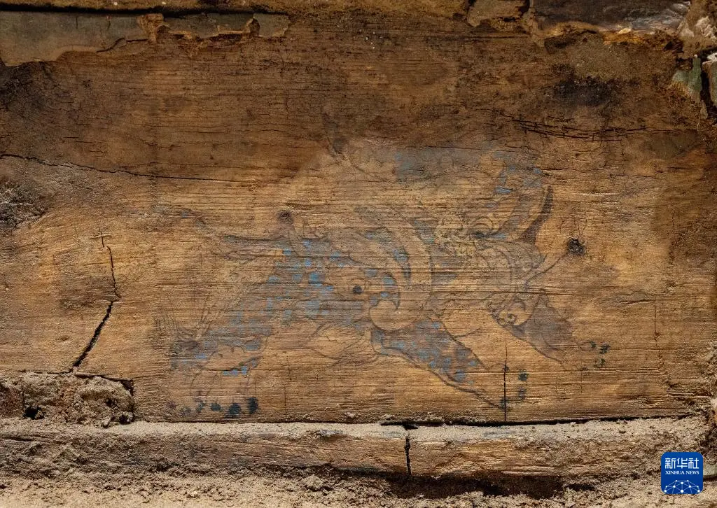这是在实验室考古方舱内拍摄的彩绘着朱雀图案的木棺前档(2月1日摄)。
