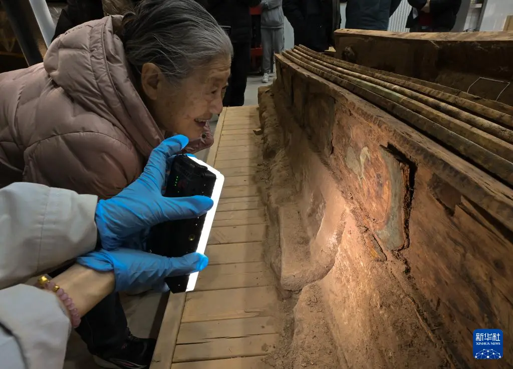 中国社会科学院考古研究所研究员安家瑶在实验室考古方舱内仔细察看墓葬M20出土木棺座上的彩绘图案(2月1日摄)。