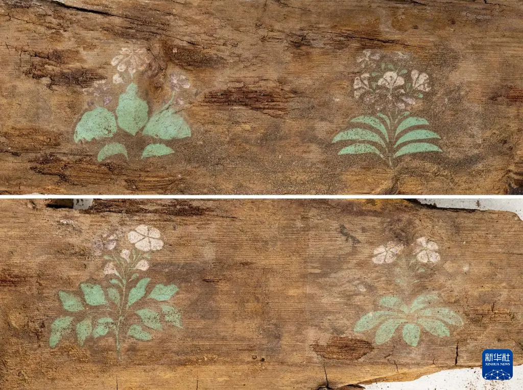 拼版照片:这是在实验室考古方舱内拍摄的墓葬M20出土棺板上的彩绘花卉图案(2月1日摄)。