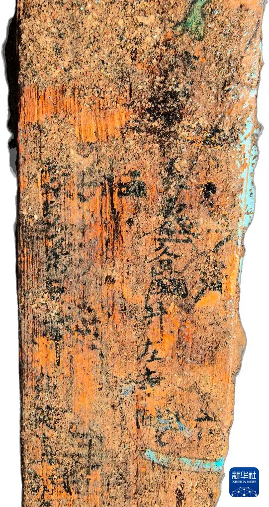这是墓葬M20墓室北壁出土的带有晕染汉字的屏风木板(资料照片)。