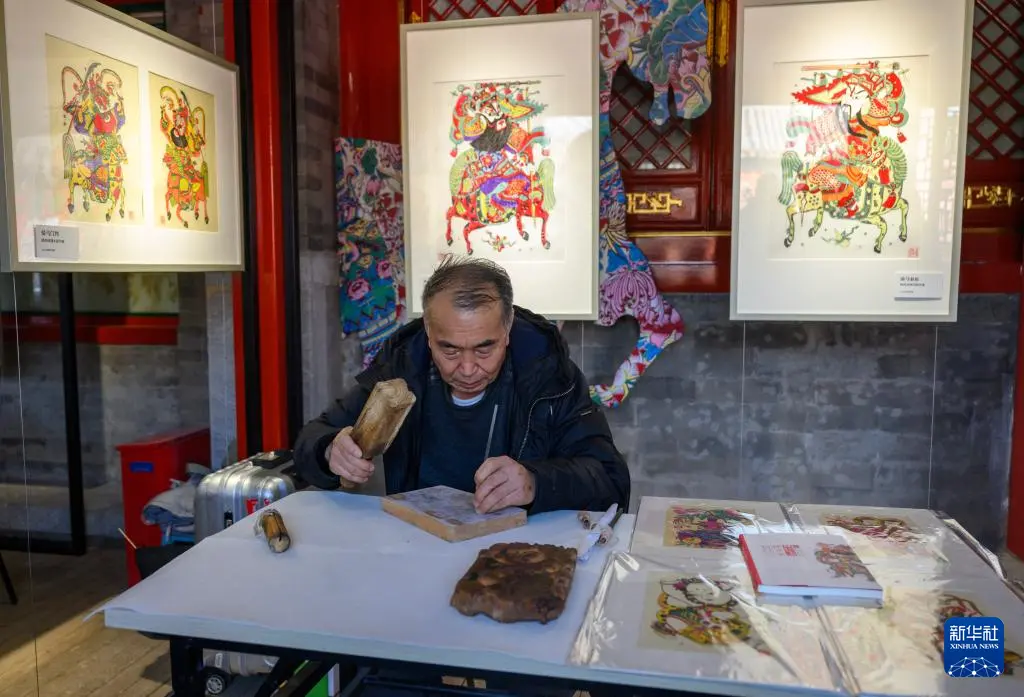 2月4日,国家级非物质文化遗产项目凤翔木版年画代表性传承人邰立平在展览现场雕版。