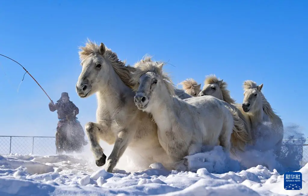 2月5日,牧民骑马在凤凰马场的雪原上奔跑。