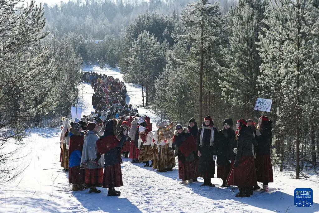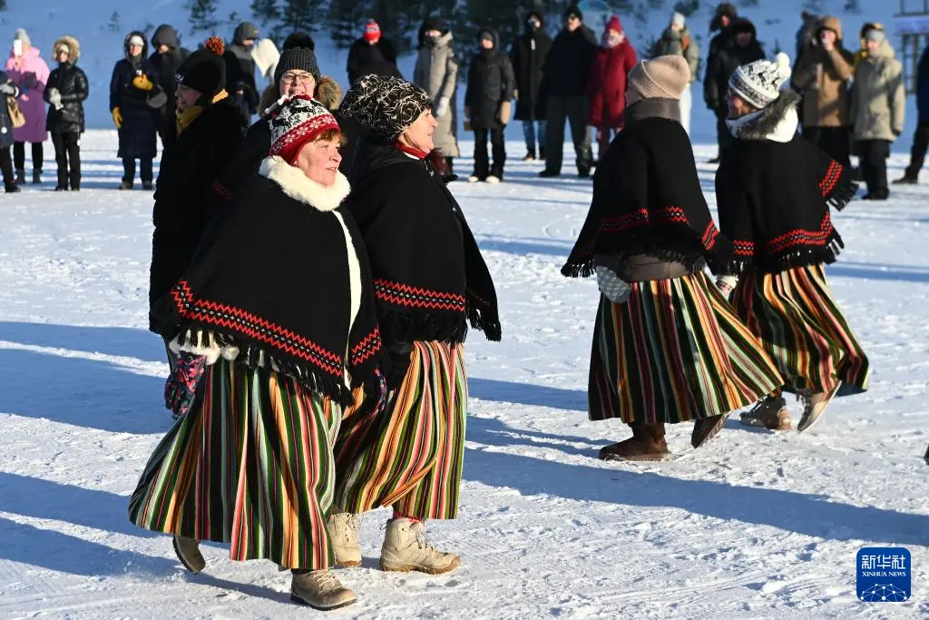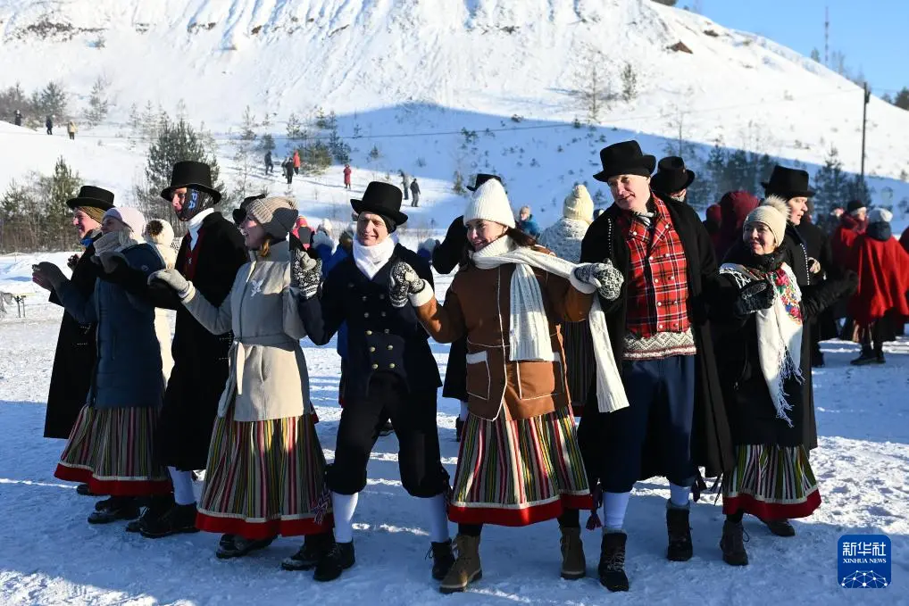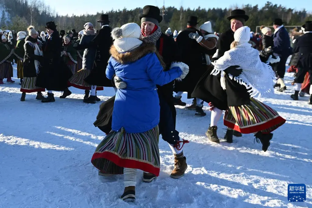 2月7日,在爱沙尼亚东北部小镇科赫特拉-诺梅,人们身着民族服装参加冬季舞蹈节。