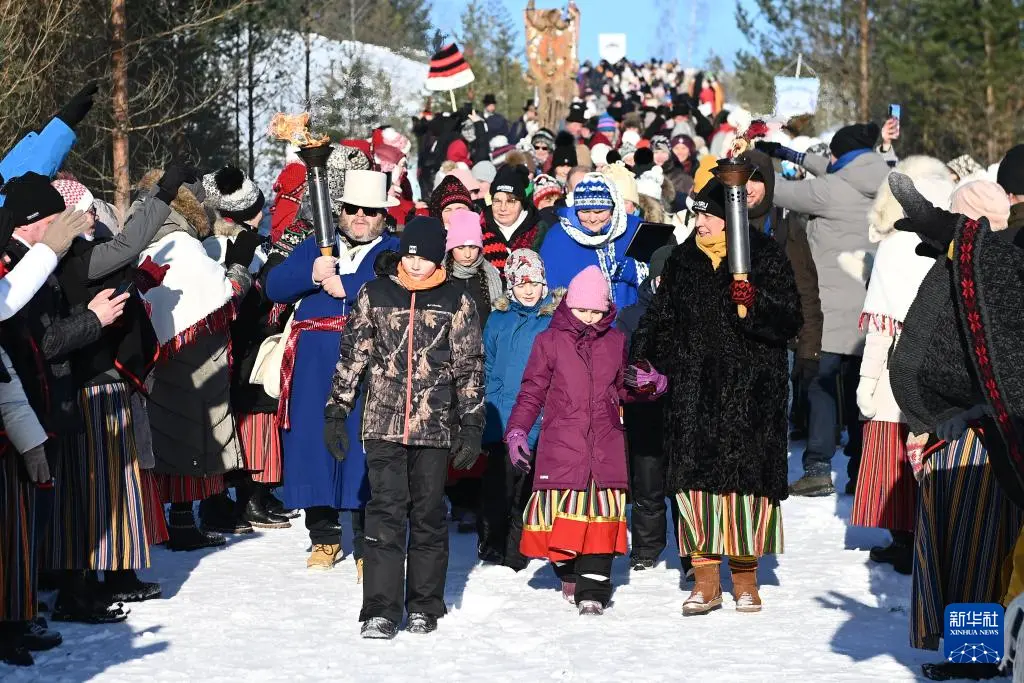2月7日,在爱沙尼亚东北部小镇科赫特拉-诺梅,人们参加冬季舞蹈节上的火炬巡游活动。