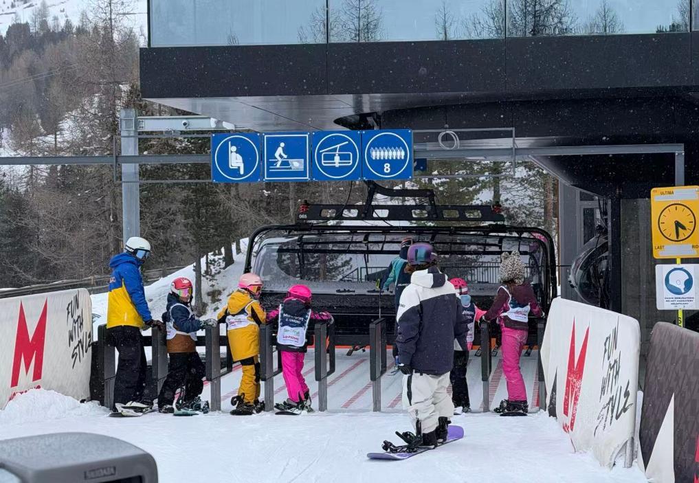 我随“双板初学组”抵达山下缆车站后,工作人员立即调慢运行速度,并协助维持上车秩序。从娴熟度来看,这就是他们的日常工作场景。由于该组小朋友众多,我担心采访会影响安全,所以决定去人数相对较少的“双板竞技组”看看。