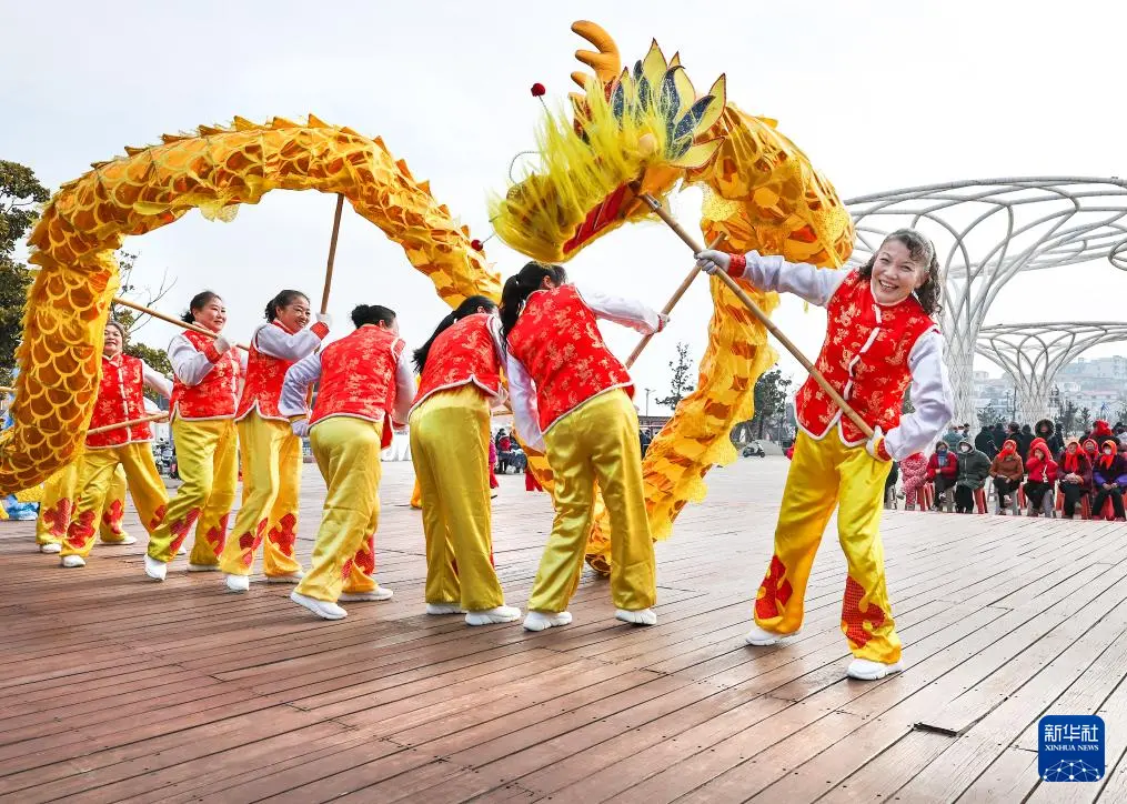 2月10日,民间艺人在江苏省连云港市高公岛街道渔人码头广场表演舞龙。