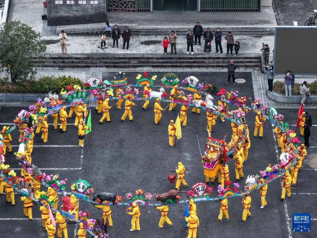 2月10日,诸暨市赵家镇赵家社区村民抬着板凳龙在镇综合文化站广场上舞动(无人机照片)。