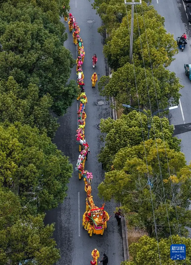 2月10日,诸暨市赵家镇赵家社区村民抬着板凳龙穿行在街巷中(无人机照片)。