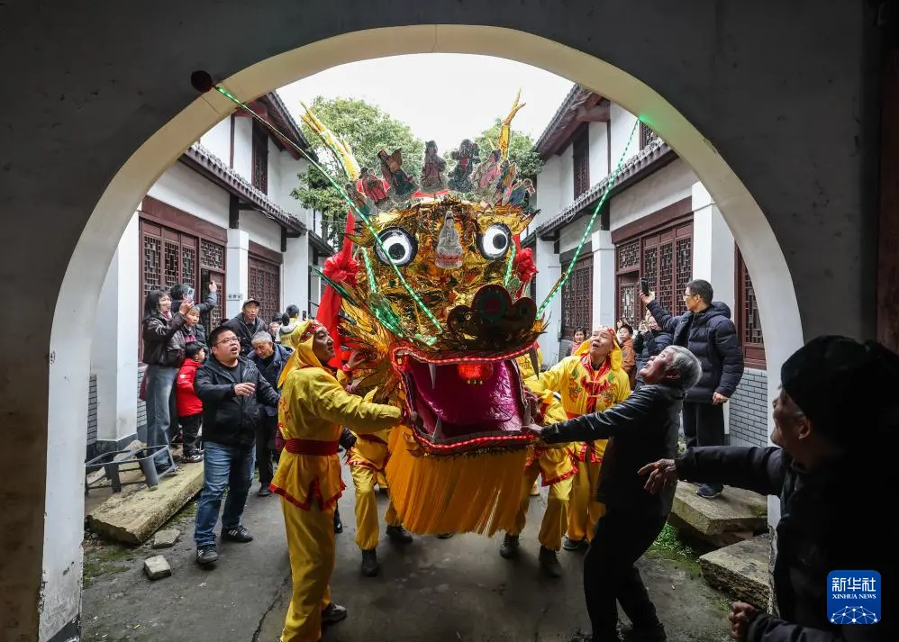 2月10日,诸暨市赵家镇赵家社区村民抬着板凳龙在镇综合文化站广场上舞动。